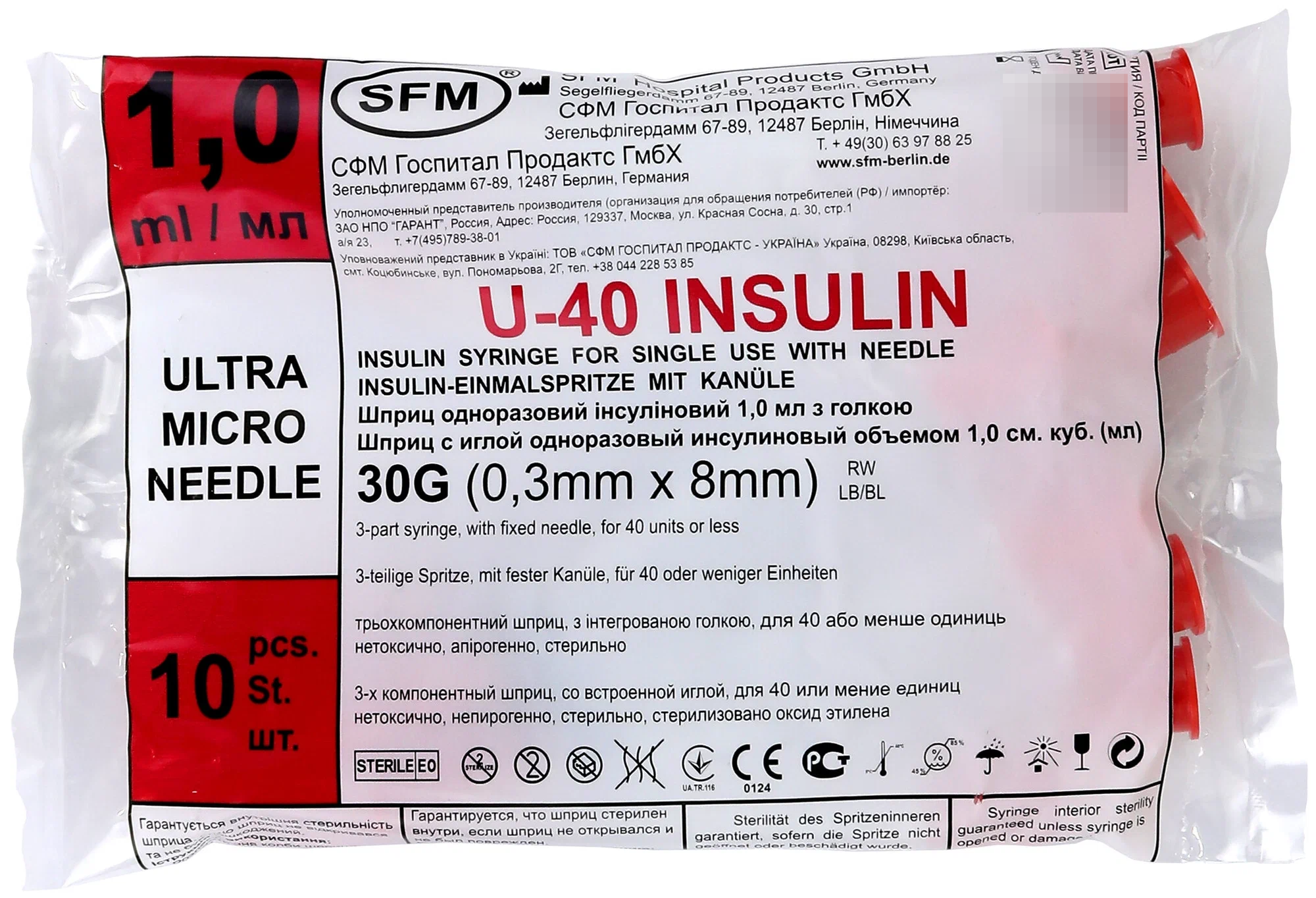Шприц инъекционный инсулиновый SFM 1 мл, (шкала U-40) применяют для инъекций инсулина.