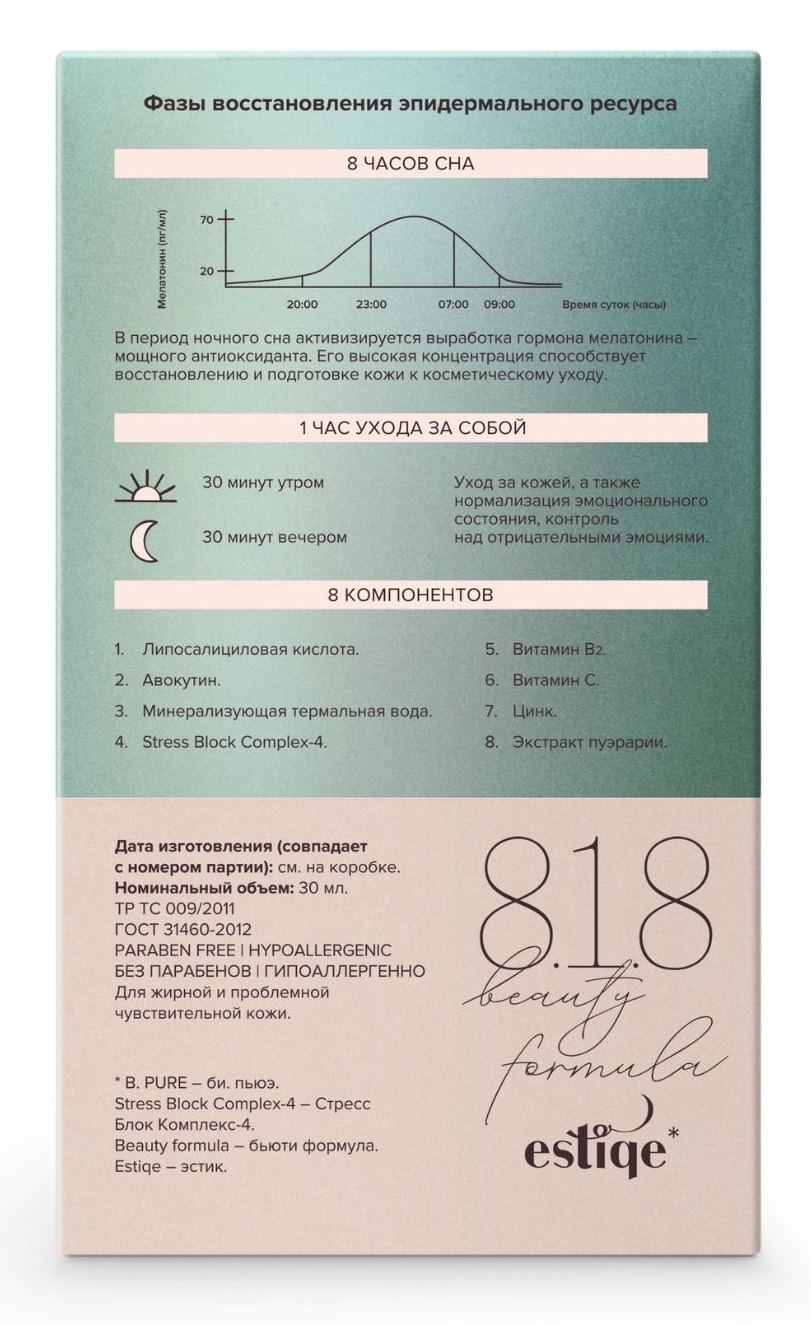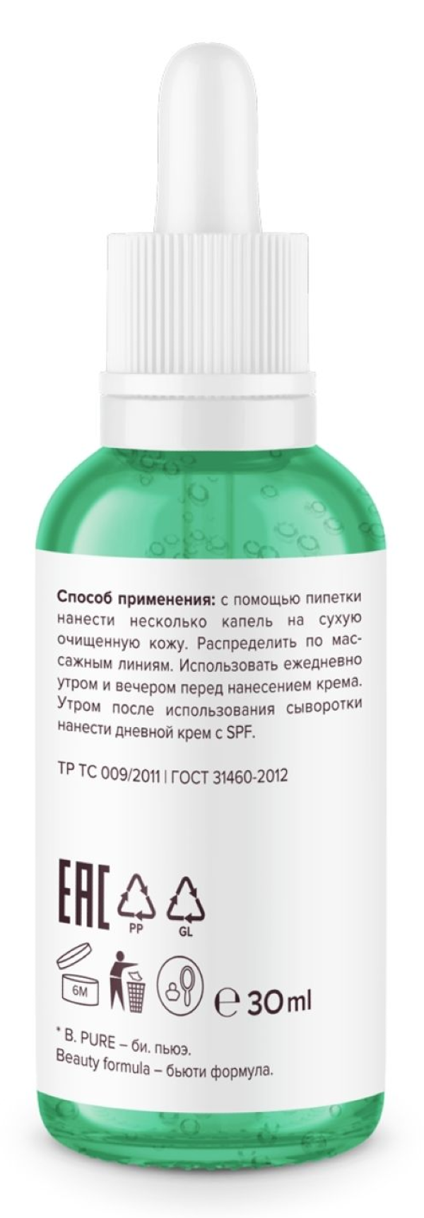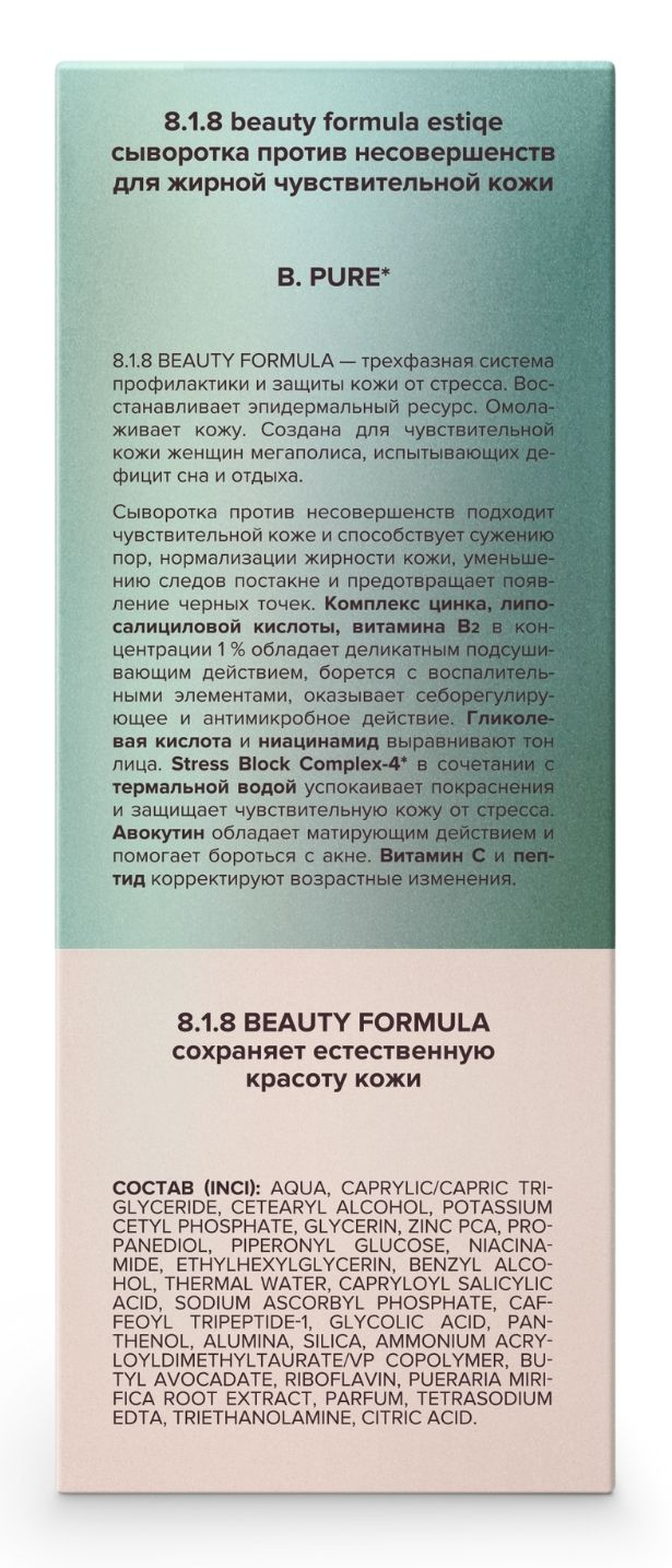 Продукт реализуется в индивидуальной упаковке. Сыворотка 8.1.8 beauty formula B. Pure содержит в своем составе следующие компоненты: AQUA, CAPRYLIC/CAPRIC TRIGLYCERIDE, CETEARYL ALCOHOL, POTASSIUM CETYL PHOSPHATE, GLYCERIN, ZINC PCA, PROPANEDIOL, PIPERONYL GLUCOSE, NIACINAMIDE, ETHYLHEXYLGLYCERIN, BENZYL ALCOHOL, THERMAL WATER, CAPRYLOYL SALICYLIC ACID, SODIUM ASCORBYL PHOSPHATE, CAFFEOYL TRIPEPTIDE-1, GLYCOLIC ACID, PANTHENOL, ALUMINA, SILICA, AMMONIUM ACRYLOYLDIMETHYLTAURATE/VP COPOLYMER, BUTYL AVOCADATE, RIBOFLAVIN, PUERARIA MIRIFICA ROOT EXTRACT, PARFUM, TETRASODIUM EDTA, TRIETHANOLAMINE, CITRIC ACID. Объем флакона — 30 мл. Бьюти-ингредиенты — цинк.