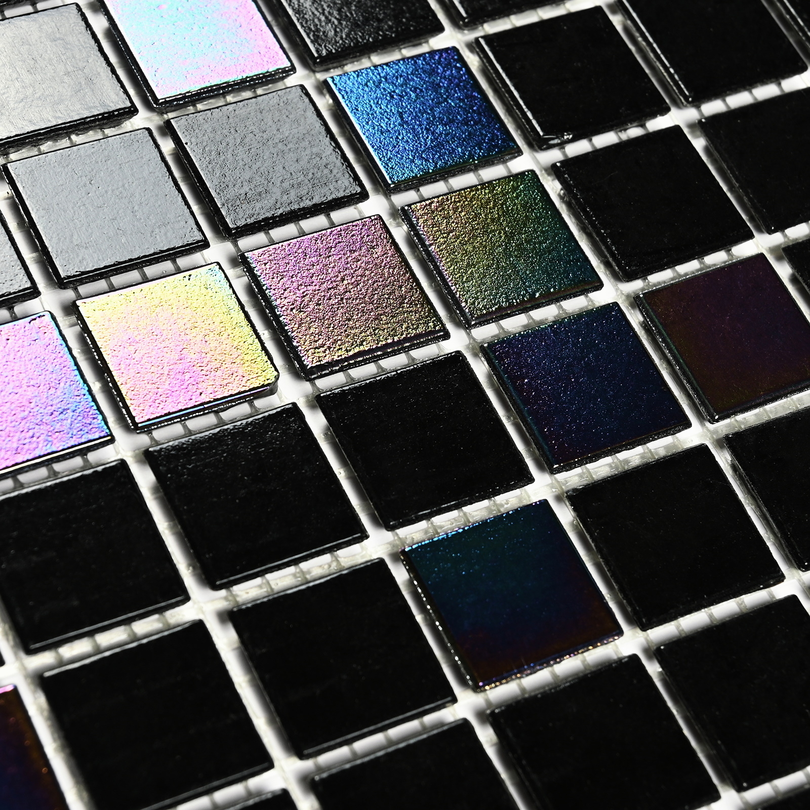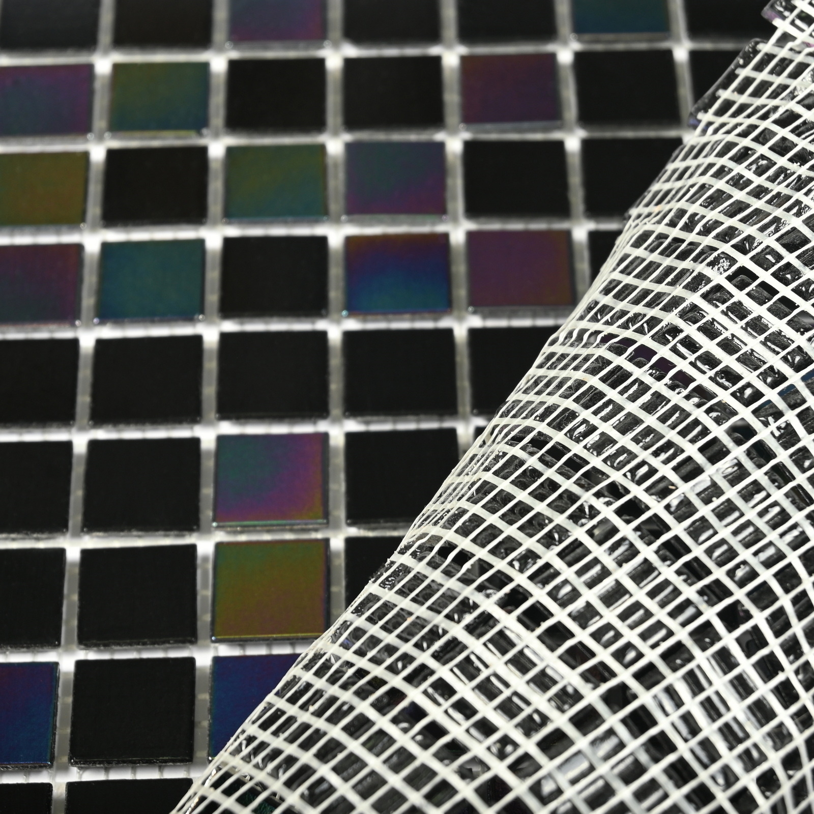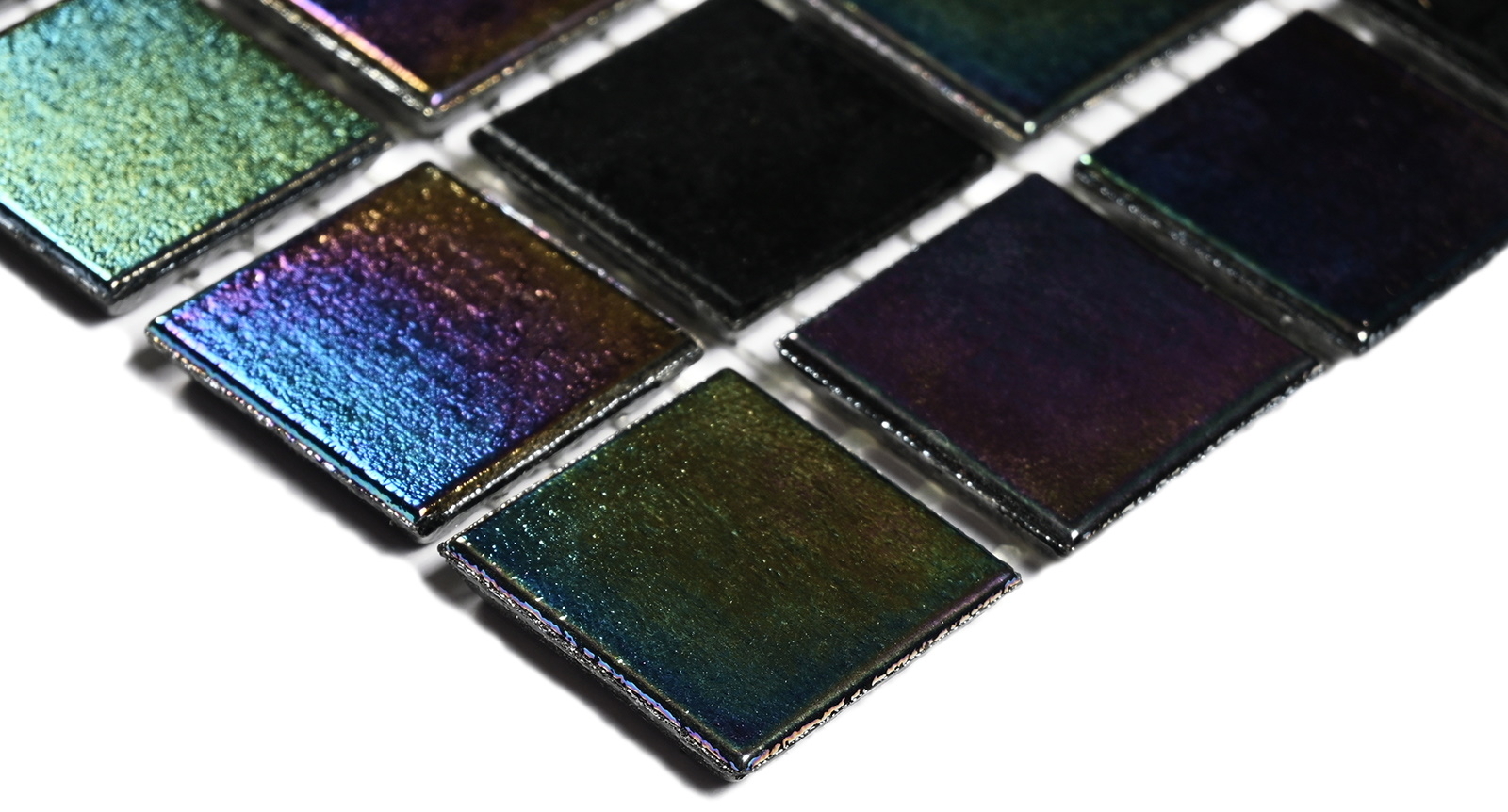 Декоративная стеклянная мозаика размером 32,7×32,7 см и размером чипа 20×20 мм. Одним из красивейших отделочных материалов считается стеклянная мозаика. Она представляет собой листы, куда уже нанесена плитка с определенным рисунком. Это значит, что укладывать ее не сложнее, чем обычный кафель. Даже проще, так как мозаика стеклянного типа может разрезаться по стыкам плиток.