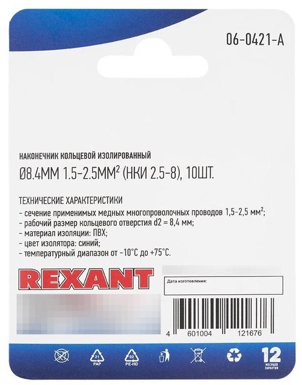 Изолированный кольцевой наконечник REXANT состоит из двух компонентов - металлического коннектора из латуни, с поверхностным электролитическим лужением и защитного изолятора из поливинилхлорида (ПВХ). Обжатие производится специальными пресс-клещами поверх защитного изолятора.