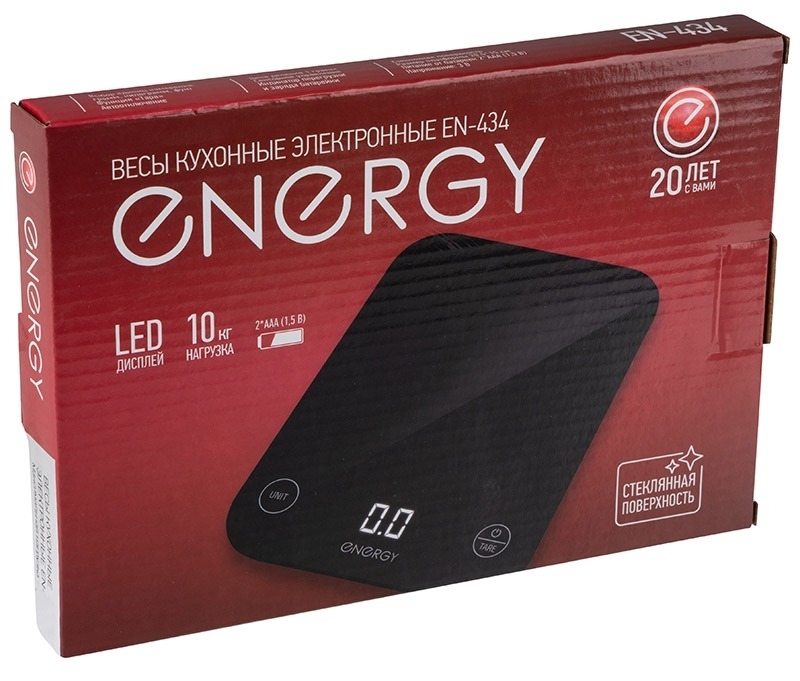 Весы кухонные электронные EN-434 10кг ENERGY — электронное устройство со стеклянным корпусом, позволяющее взвешивать продукты. Результат измерений выводится на ЖК-экран. Максимальная нагрузка, которую выдерживает устройство — 10 кг. Предусмотрена тарокомпенсация. Корпус весов EN-434 10кг ENERGY сделан из пластика и дополнен нескользящими прорезиненными ножками. В качестве источника питания используется батарейка типа 2хААА, которые входят в комплект поставки. Экономию заряда обеспечивает автоматическое выключение.