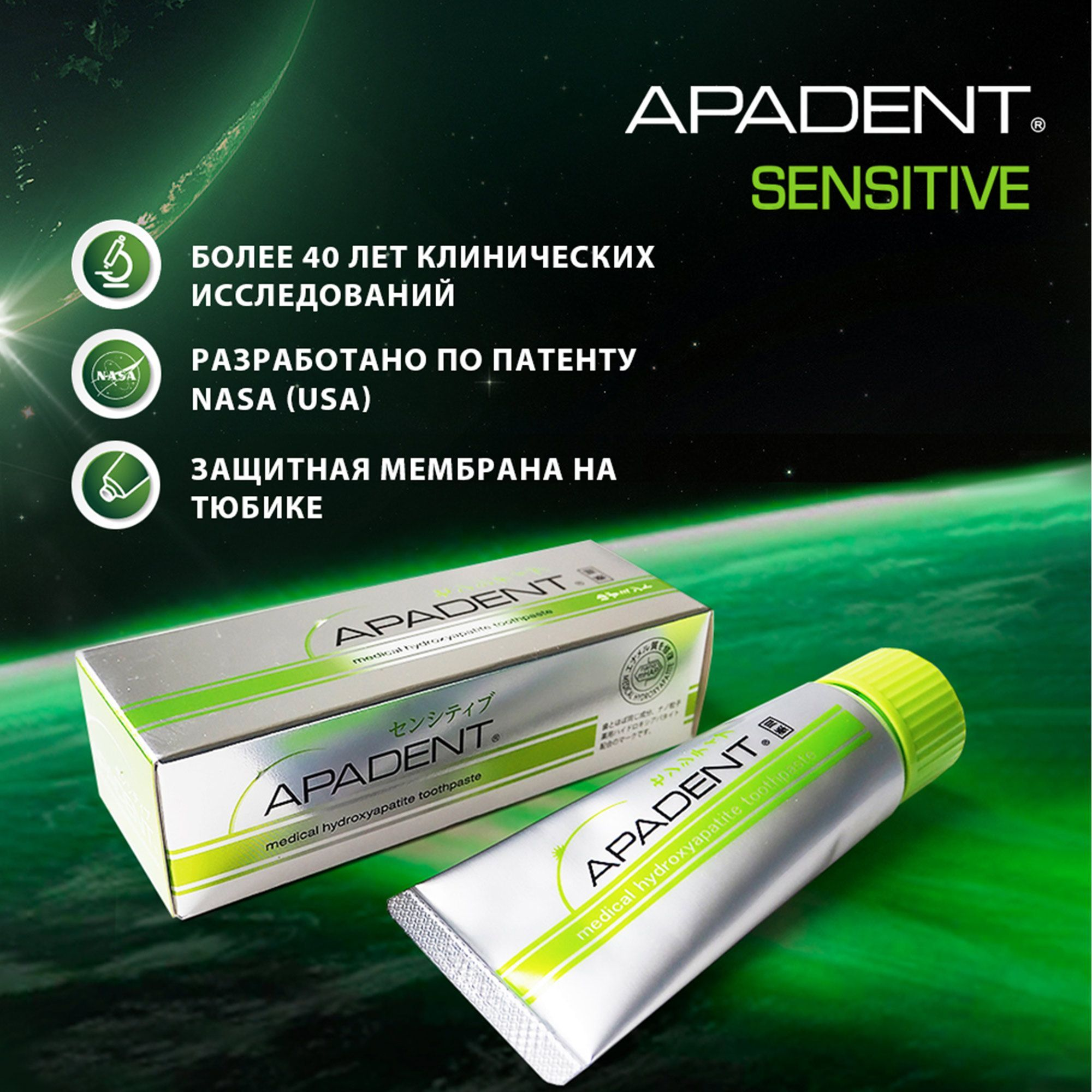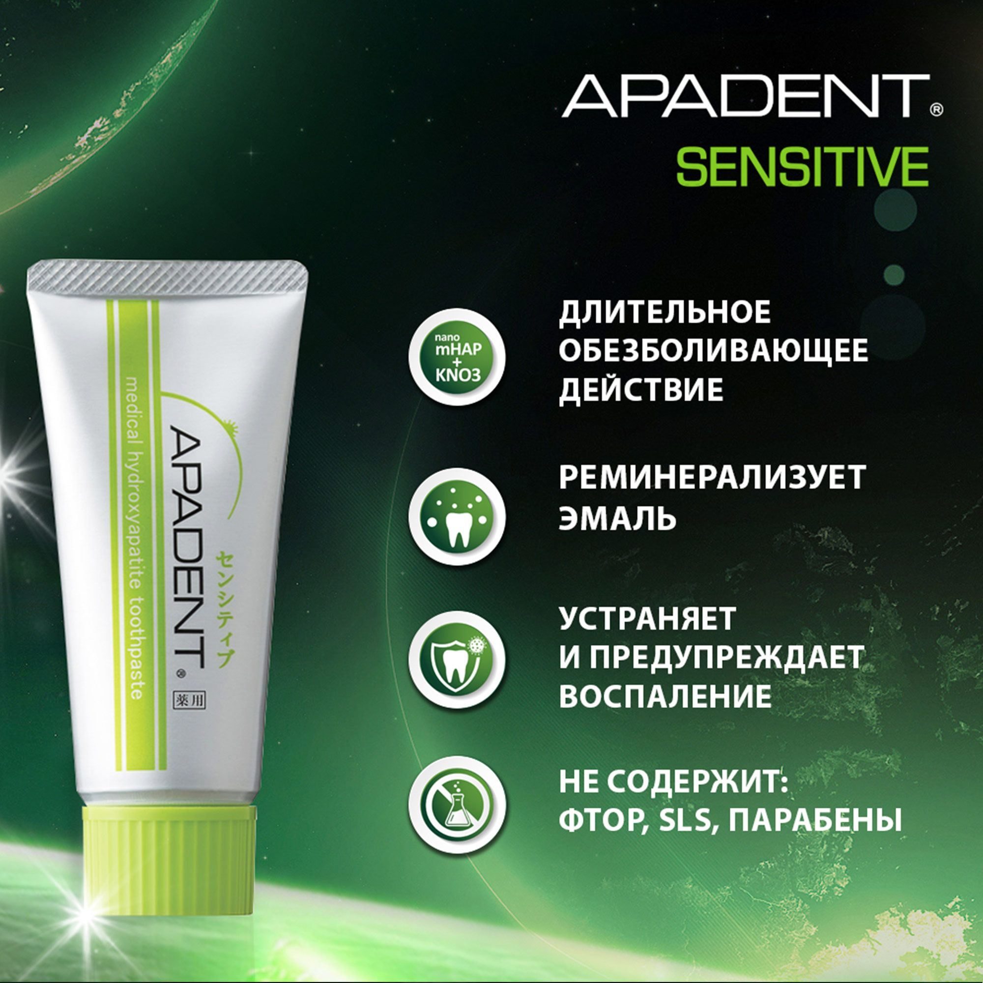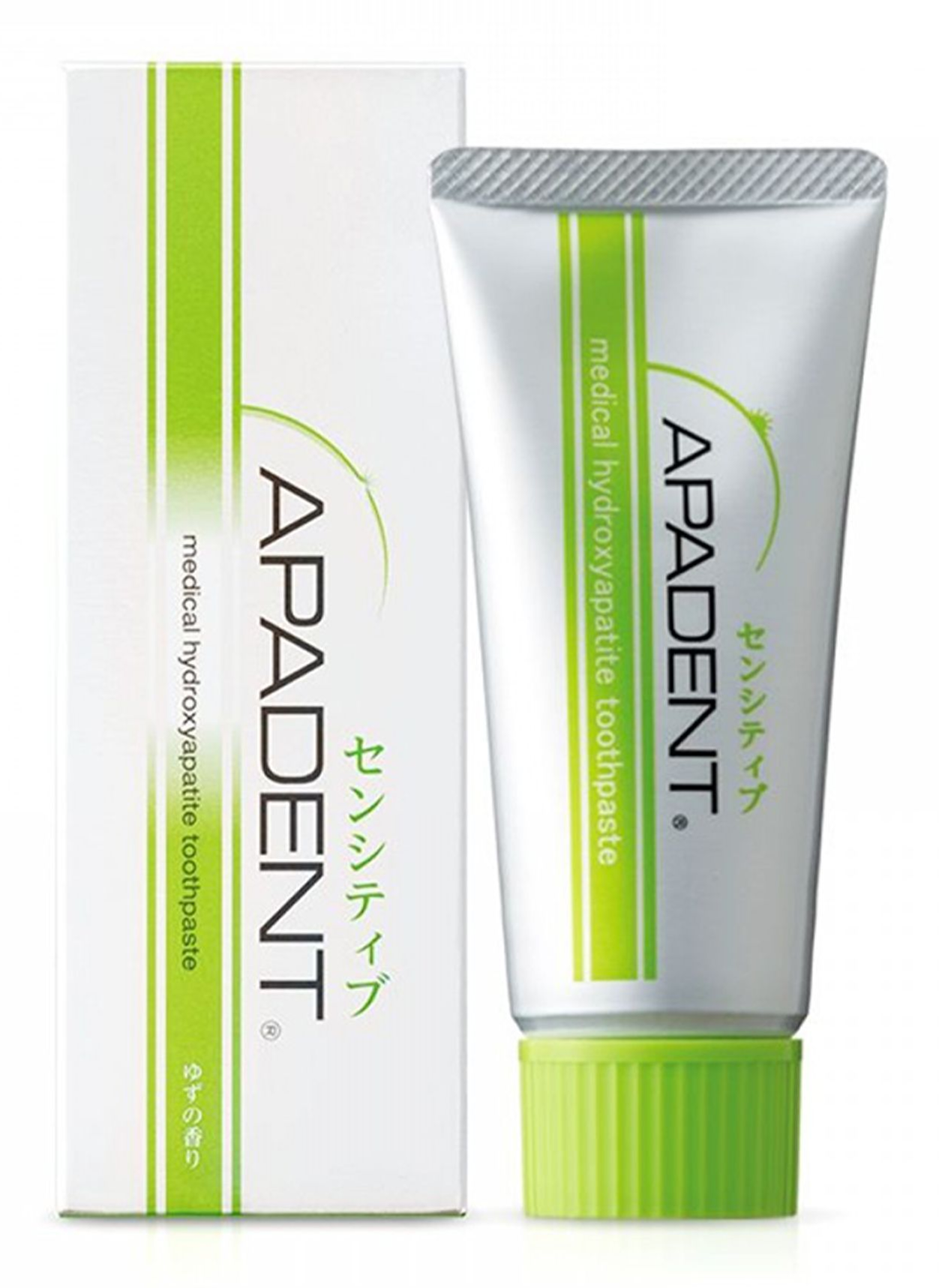Apadent Sensitive — это зубная паста для укрепления и снижения чувствительности зубов, уникальная разработка компании Sangi (Япония) по патенту NASA. Активный компонент пасты — медицинский нано-гидроксиапатит (нано-ГАП), искусственно синтезированный аналог натурального гидроксиапатита, составляющего 96% зубной эмали. Несколько десятков лет упорного труда и многочисленных испытаний привели японских ученых к способу встраивания ГАП в кристаллическую решетку зуба. Паста подходит для ежедневного использования, а также для реминерализации чувствительных зубов во время и после ношения брекетов, беременности, отбеливания зубов.