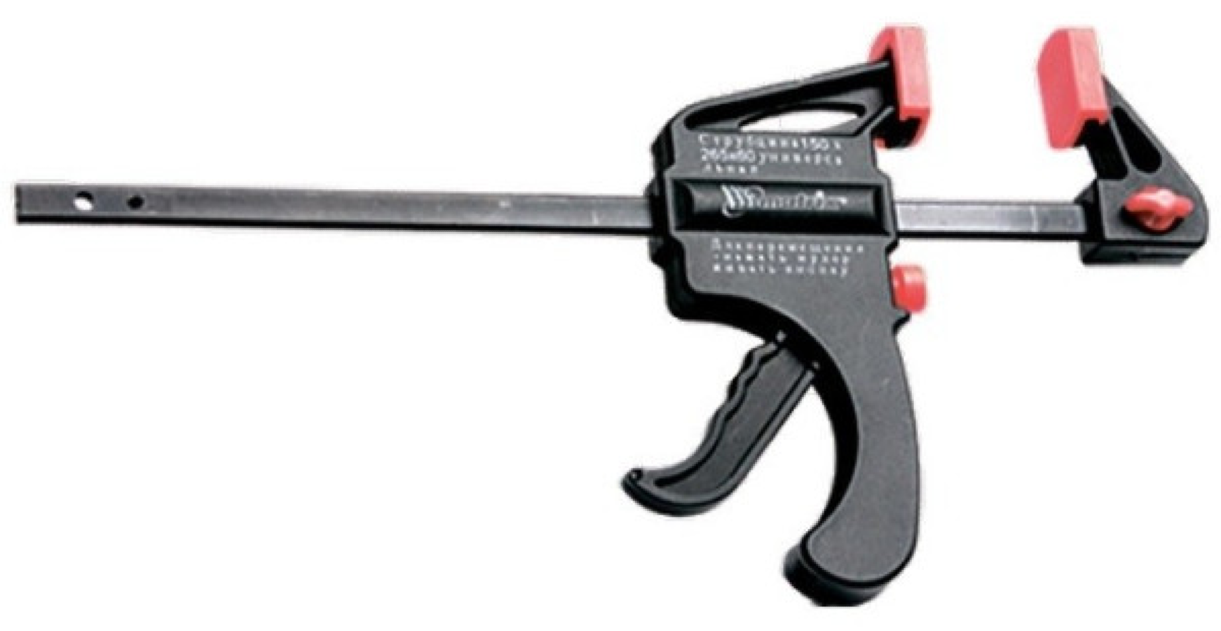 Струбцина изготовлена из ударопрочной пластмассы. Направляющая стальная. Рабочие губки снабжены накладками для предотвращения повреждений обрабатываемых предметов. Опорная губка перемещается и фиксируется по всей длине направляющей при помощи ручки, а также может переставляться на другой конец направляющей, что позволяет использовать струбцину «на разжим».