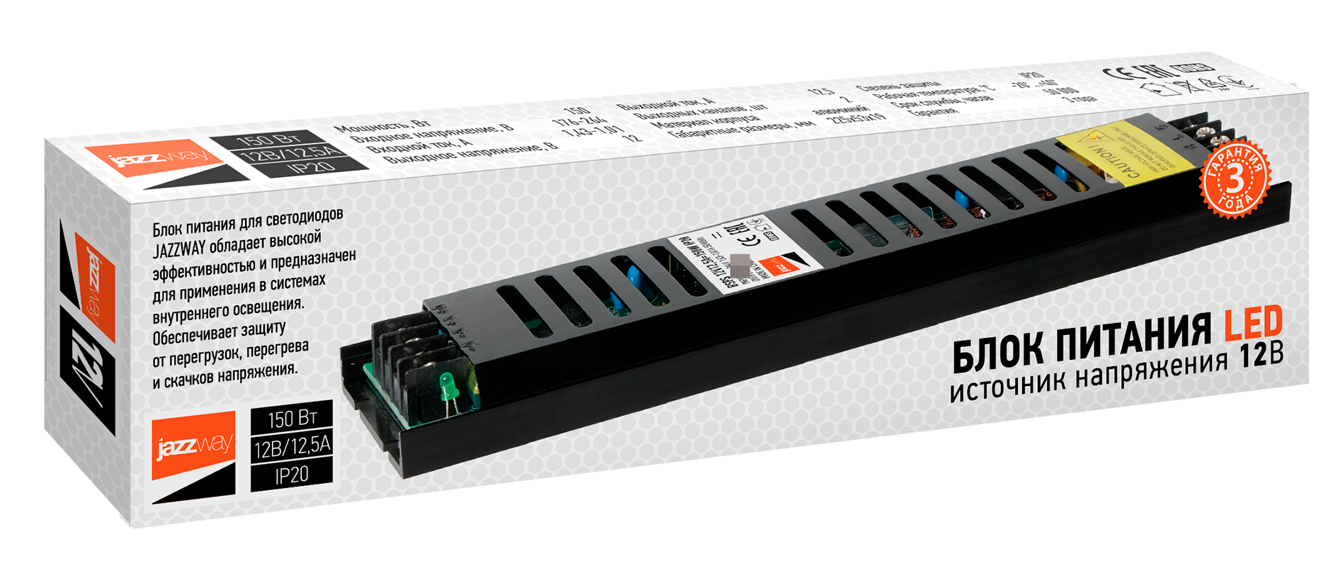 - Драйвер Jazzway BSPS для светодиодной ленты, в металлическом корпусе, черный, 225х53х19мм, 12.5А 150Вт 12В - 1шт.