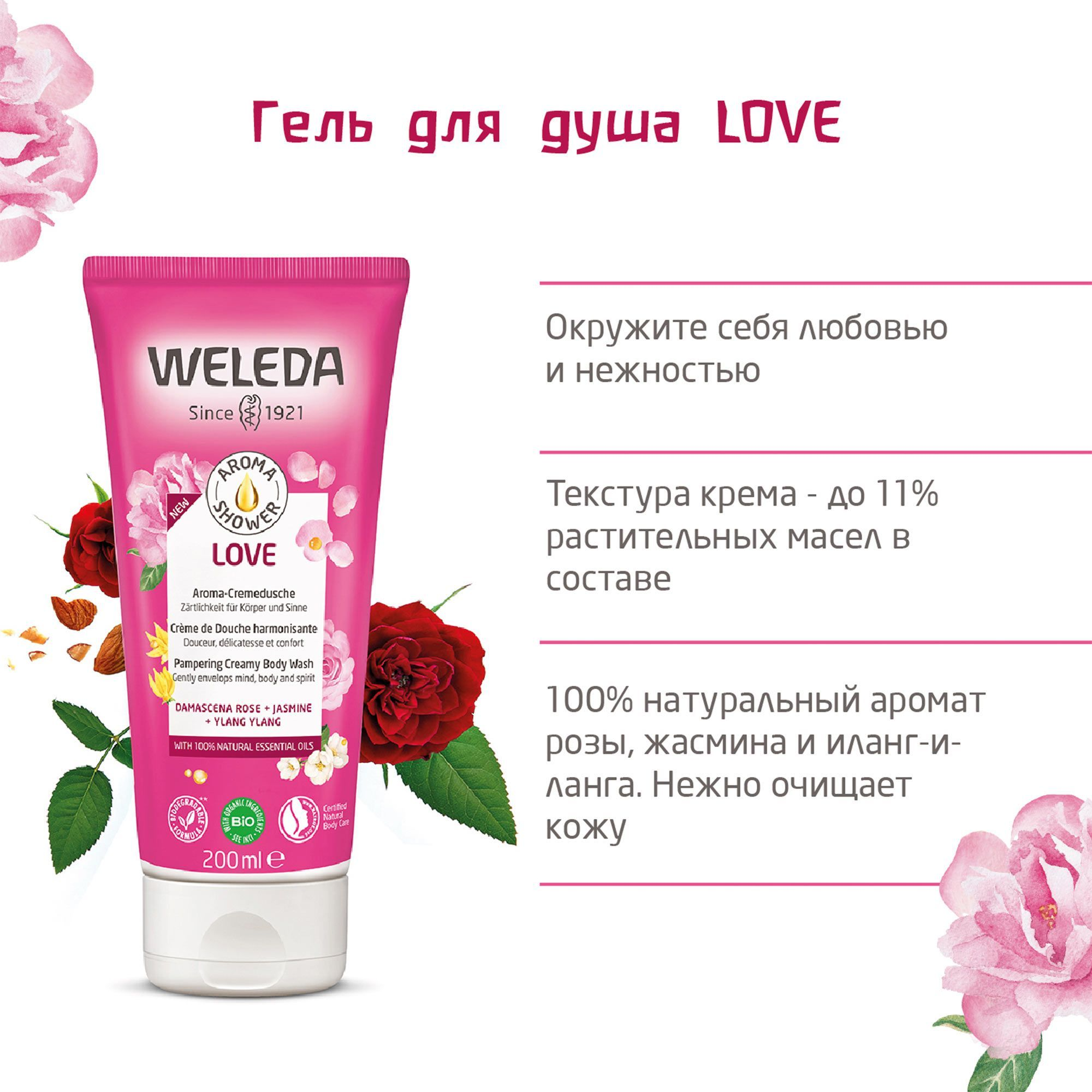 Weleda Love увлажняющий Гель для душа — это деликатное средство для очищения кожи. Weleda Гель для душа тщательно очищает кожу благодаря бережным компонентам и увлажняет ее, надежно защищая от сухости.