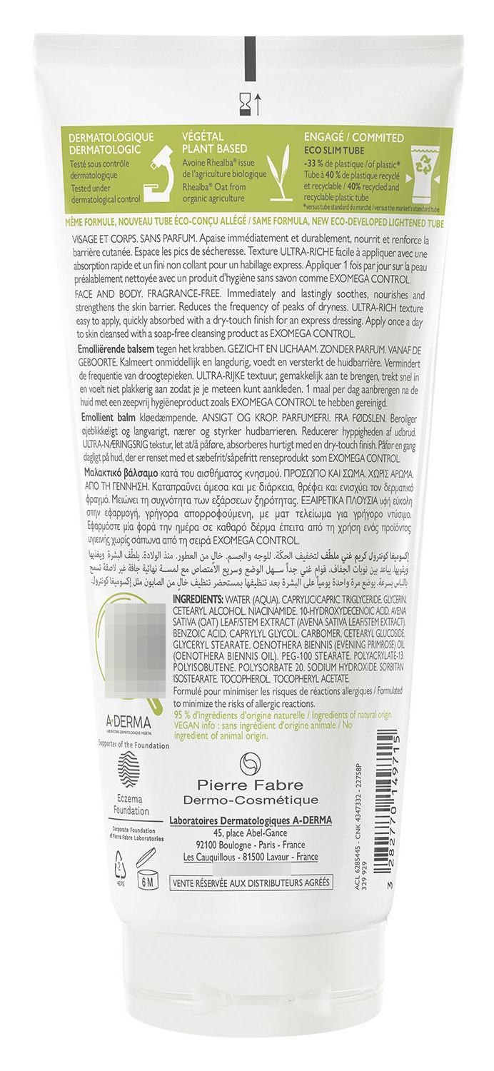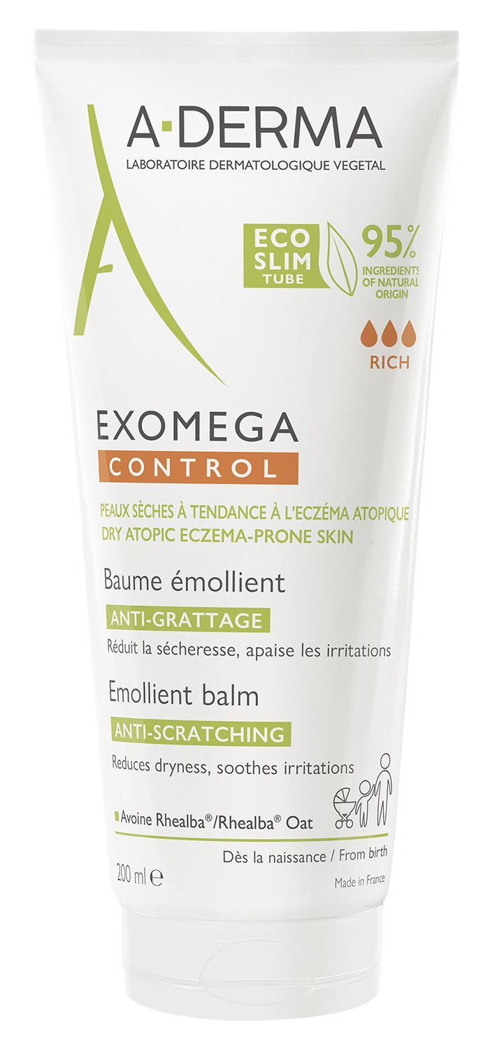 A-Derma Exomega Control Смягчающий бальзам для лица и тела. Для ухода за сухой, склонной к атопии кожи. Для новорожденных, детей и взрослых. Мгновенно успокаивает сухую кожу и способствует снижению раздражения, вызванного сухостью кожи. Не содержит отдушек. Может использоваться для новорожденных. Для сухой, склонной к атопии кожи.
