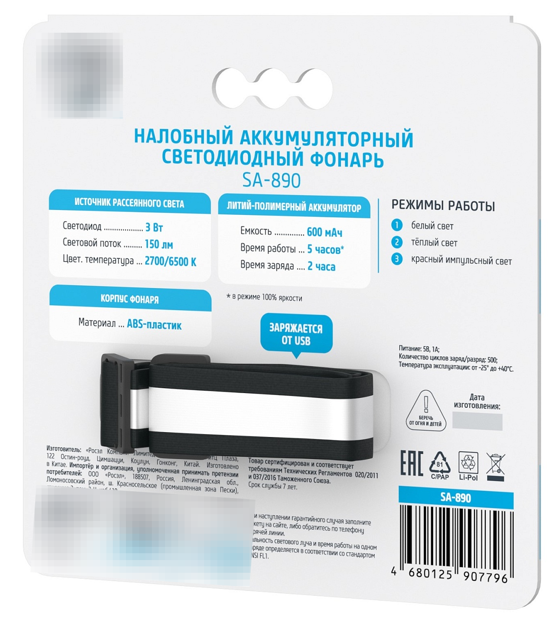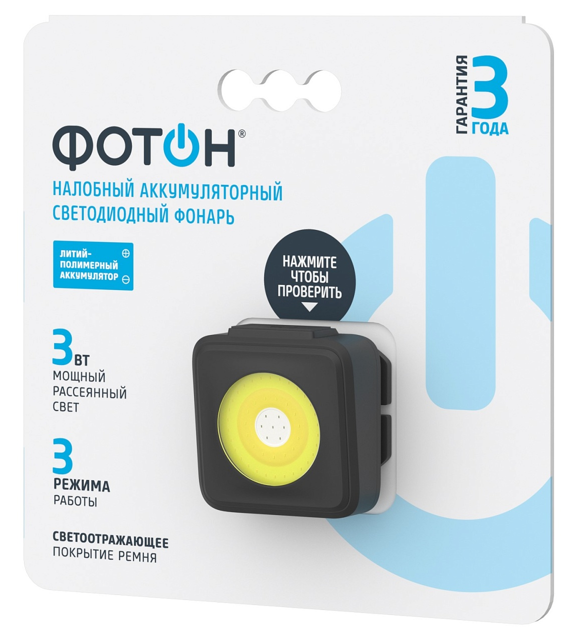 - Фонарь налобный светодиодный Фотон SA-890 аккумуляторный Li-Pol 600 мАч, 3 режима, светоотражающее покрытие эластичного ремня, LED 3Вт, 25904 - 1шт.