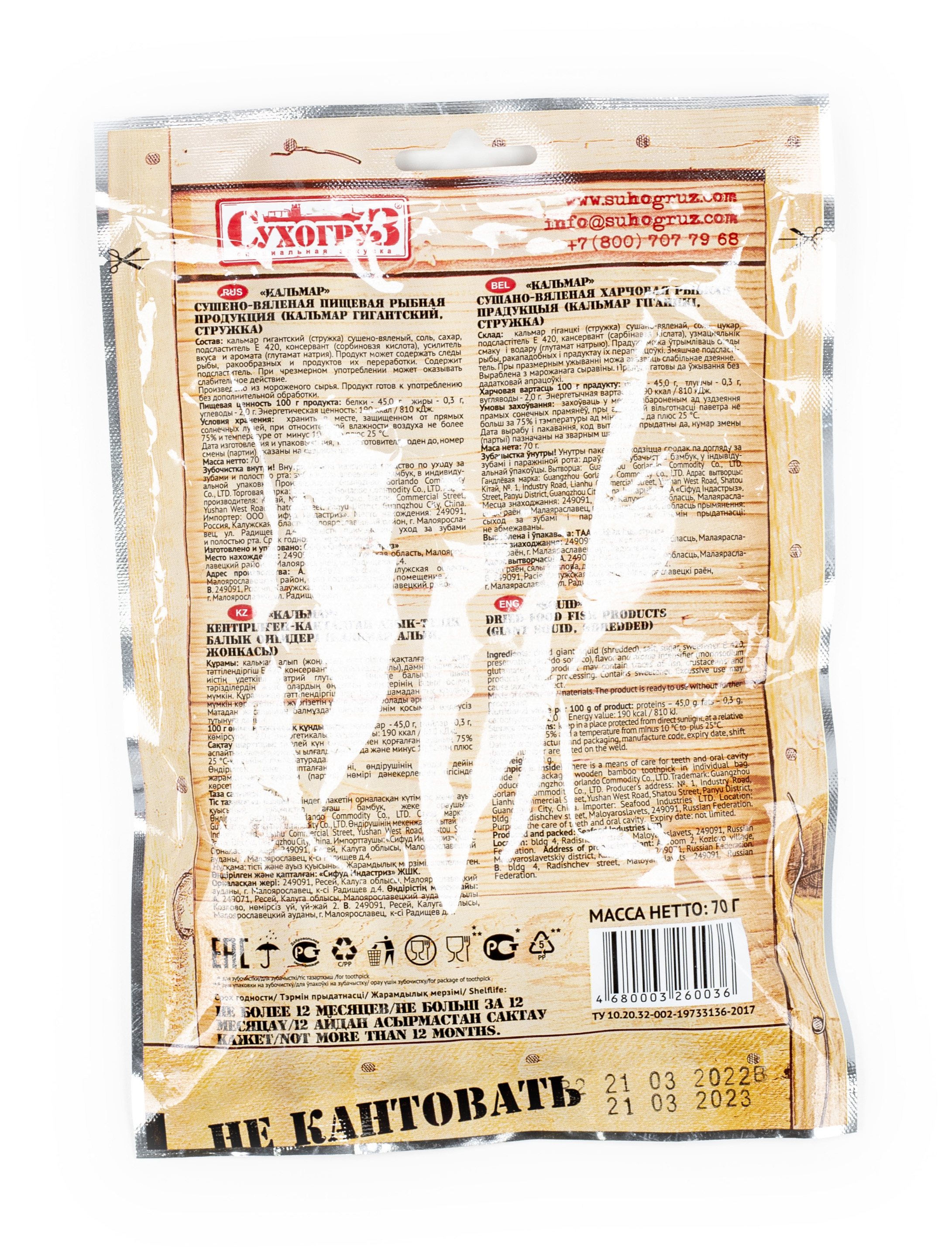 - Кальмар гигантский (стружка) сушено-вяленый, соль, сахар, подсластитель (сорбитол), консервант (сорбиновая кислота), усилитель вкуса и аромата (глутамат натрия).