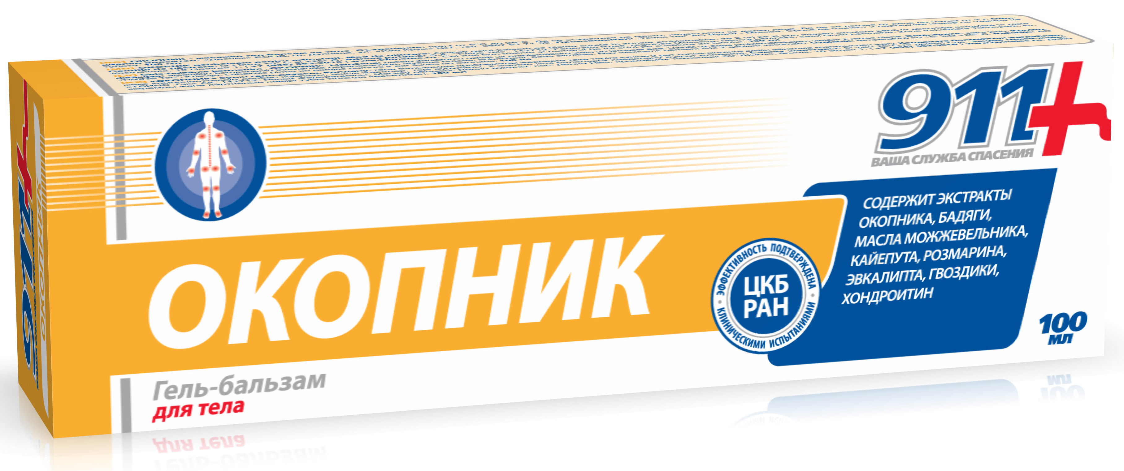 Продукт реализуется в индивидуальной упаковке — тубе, объем — 100 мл. Крем для тела 911 Окопник содержит в своем составе: вода, экстракт окопника, экстракт бадяги, изооктил стеарат, триэтаноламин, акрилаты /С10-30 алкил акрилат кроссполимер, ментол, камфора, хондроитина сульфат, масло можжевельника, масло кайепута, масло розмарина, масло эвкалипта, масло гвоздики, пропиленгликоль (и) диазолидинил мочевина (и) метилпарабен (и) пропилпарабен, лимонен, эвгенол, линалоол.