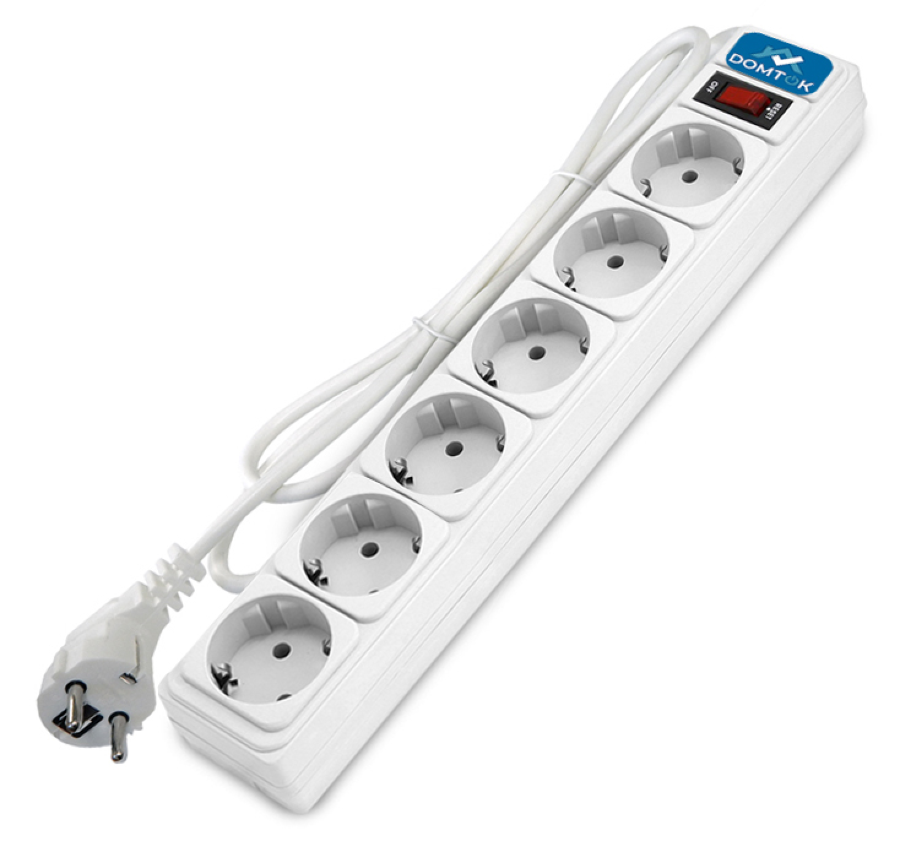 - Сетевой фильтр DOMTOK с заземлением и выключателем, 10А 5 метров, 2200Вт, 6 гнезд, белый, 2517