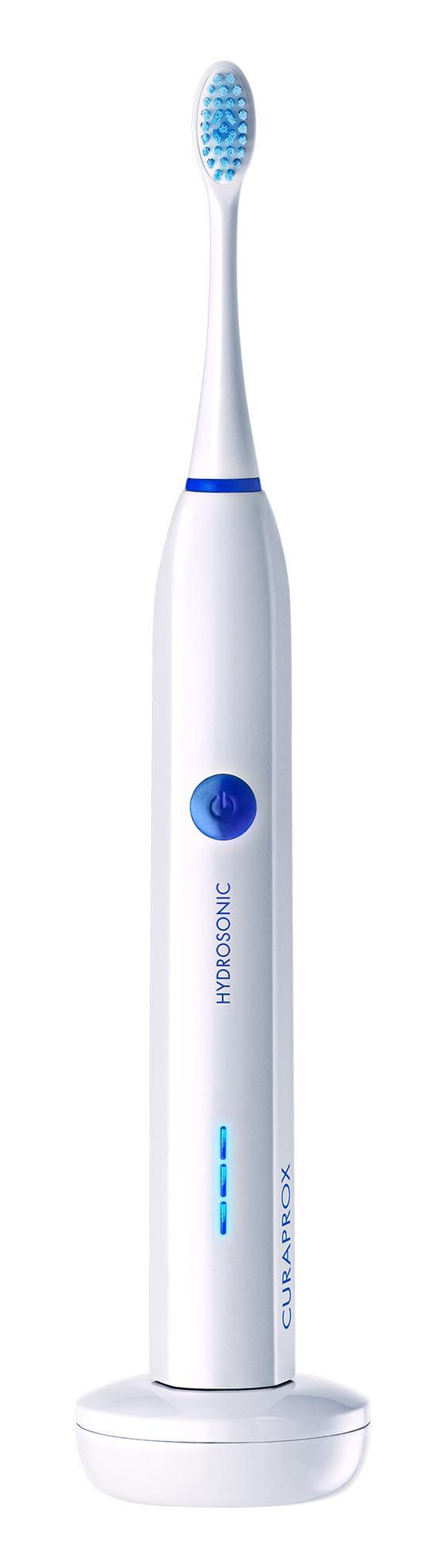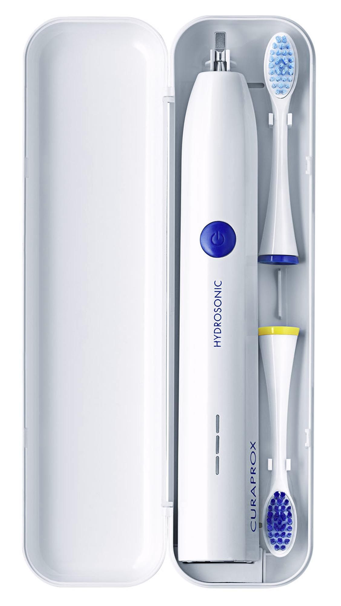 CURADEN AG, Швейцария, Электрическая зубная щетка «CURAPROX» серии «HYDROSONIC EASY»: в комплекте, для ежедневного применения. Имеет 3 режима работы: 1 х Старт (start), 1 х Очищающий (clean), 1 х Отбеливающий (smile). Создает 22 000 — 42 000 колебаний щетинок в минуту в зависимости от режима работы. В комплект входят: 1 инструкция по эксплуатации, 1 зарядное устройство с USB-кабелем, 1 USB-адаптер, 1 дорожный чехол, 1 электрическая щетка Hydrosonic, 1 насадка CHS 300 power, 1 насадка CHS 200 sensitive. Подходит для пломб, имплантатов, коронок и виниров. Состав ручки щетки: пластик с силиконовыми вставками. Состав насадки: щетина волокно CUREN (полиэстр). Тип жесткости щетины — мягкая. Основа насадки — полипропилен, приводной вал — нержавеющая сталь. Батарея — Lithium-ion (DC 3.7V / 700 mA h).