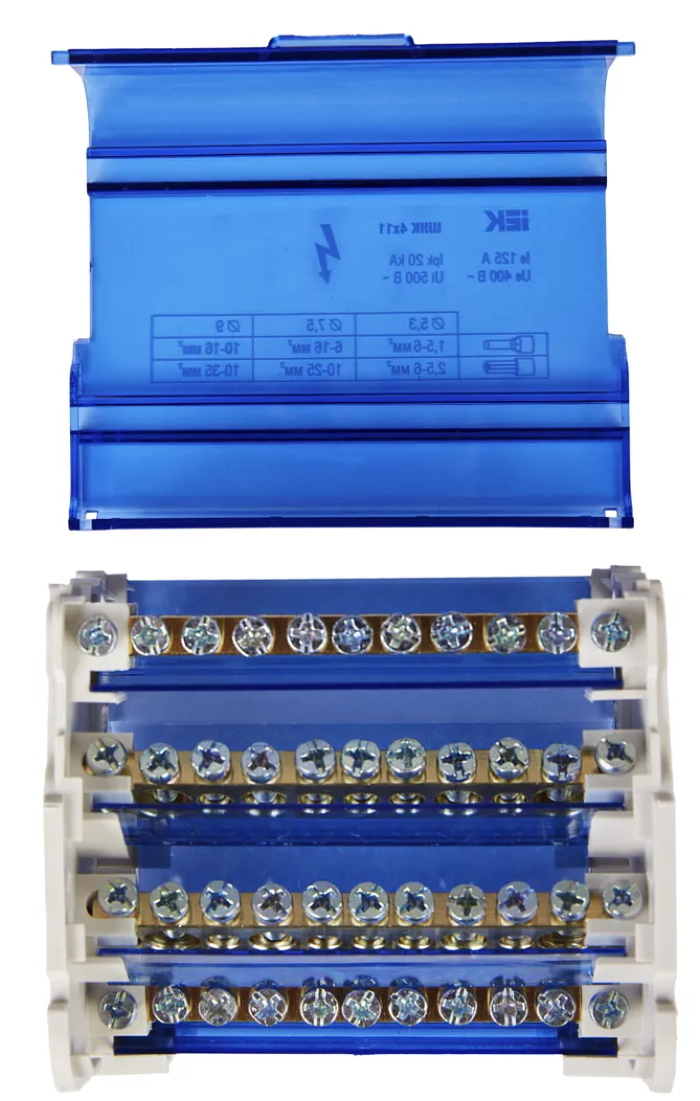 Шины выполнены из высококачественной латуни, изолирующая задняя панель и прозрачная защитная крышка выполнены из самозатухающего пластика.