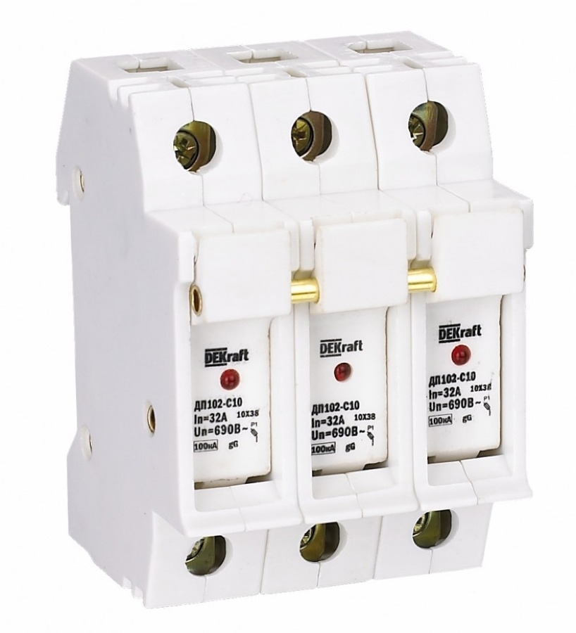 - Держатель предохранителя DEKraft ДП-102 C10 со световой индикацией под DIN-рейку, 3P 32А, переменный (АС), 500В, IP20 - 1шт.