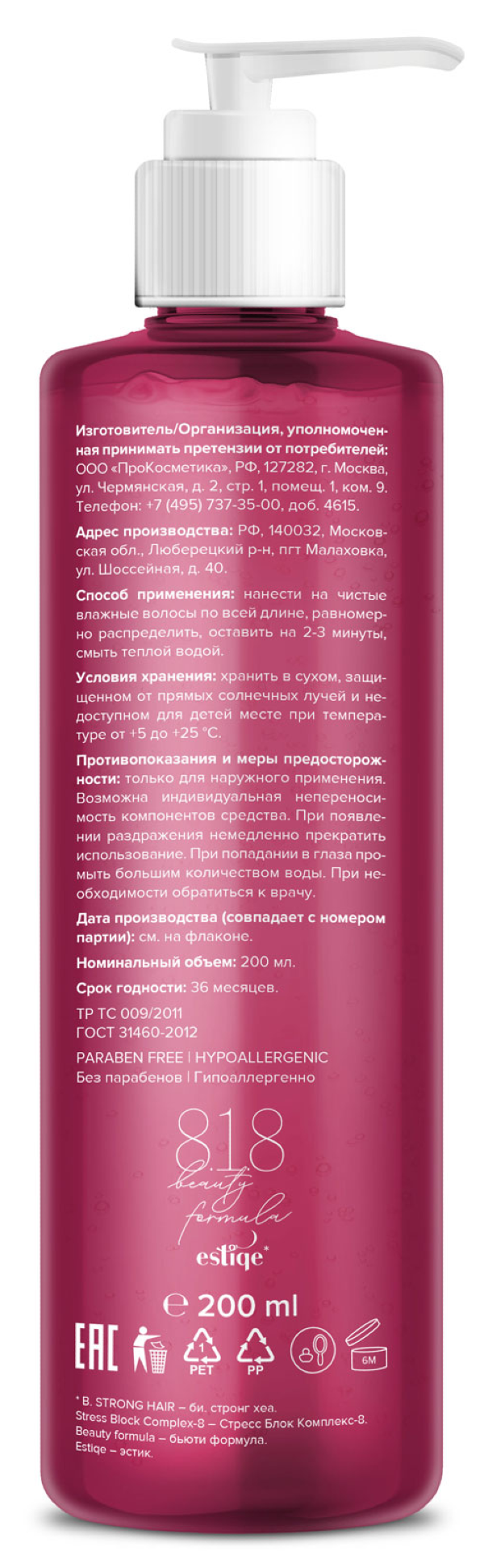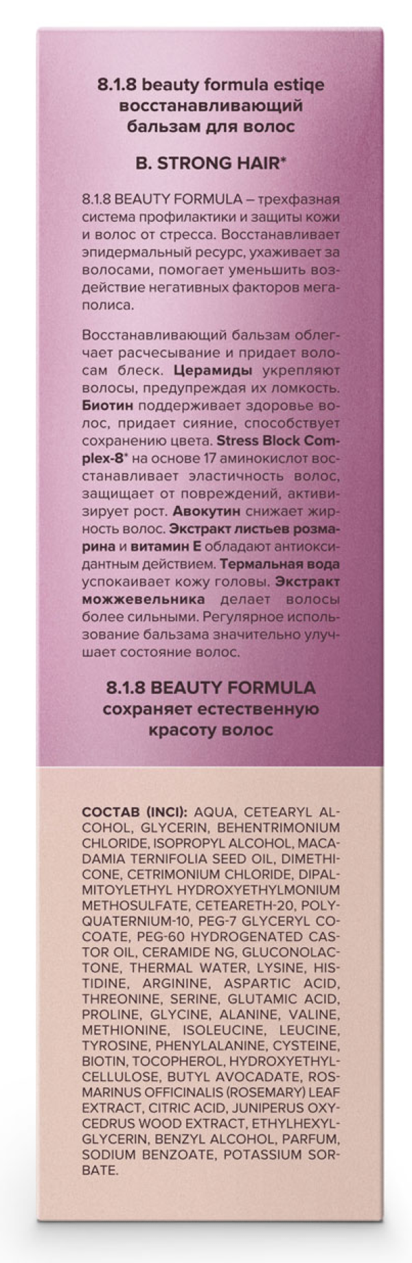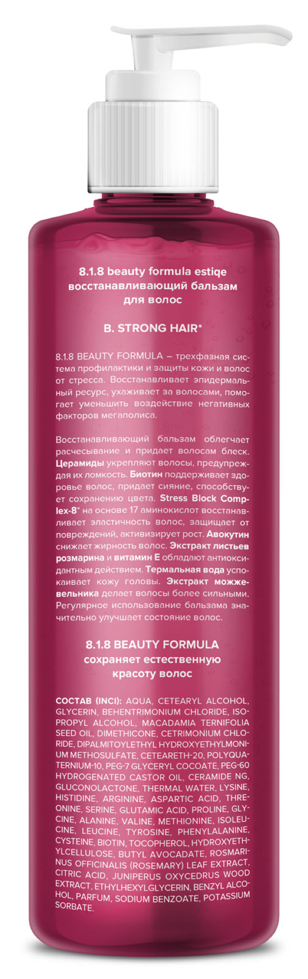 Средство реализуется в индивидуальной упаковке. Объем флакона составляет 200 мл. Бальзам для волос восстанавливающий 8.1.8 beauty formula B. Strong Hair содержит в своем составе следующие компоненты: AQUA, CETEARYL ALCOHOL, GLYCERIN, BEHENTRIMONIUM CHLORIDE, ISOPROPYL ALCOHOL, MACADAMIA TERNIFOLIA SEED OIL, DIMETHICONE, CETRIMONIUM CHLORIDE, DIPALMITOYLETHYL HYDROXYETHYLMONIUM METHOSULFATE, CETEARETH-20, POLYQUATERNIUM-10, PEG 7 GLYCERYL COCOATE, PEG 60 HYDROGENATED CASTOR OIL, CERAMIDE NG, GLUCONOLACTONE, THERMAL WATER, LYSINE, HISTIDINE, ARGININE, ASPARTIC ACID, THREONINE, SERINE, GLUTAMIC ACID, PROLINE, GLYCINE, ALANINE, VALINE, METHIONINE, ISOLEUCINE, LEUCINE, TYROSINE, PHENYLALANINE, CYSTEINE, BIOTIN, TOCOPHEROL, HYDROXYETHYLCELLULOSE, BUTYL AVOCADATE, ROSMARINUS OFFICINALIS (ROSEMARY) LEAF EXTRACT, CITRIC ACID, JINIPERUS OXYCEDRUS WOOD EXTRACT, ETHYLHEXYLGLYCERIN, BENZYL ALCOHOL, PARFUM, SODIUM BENZOATE, POTASSIUM SORBATE.