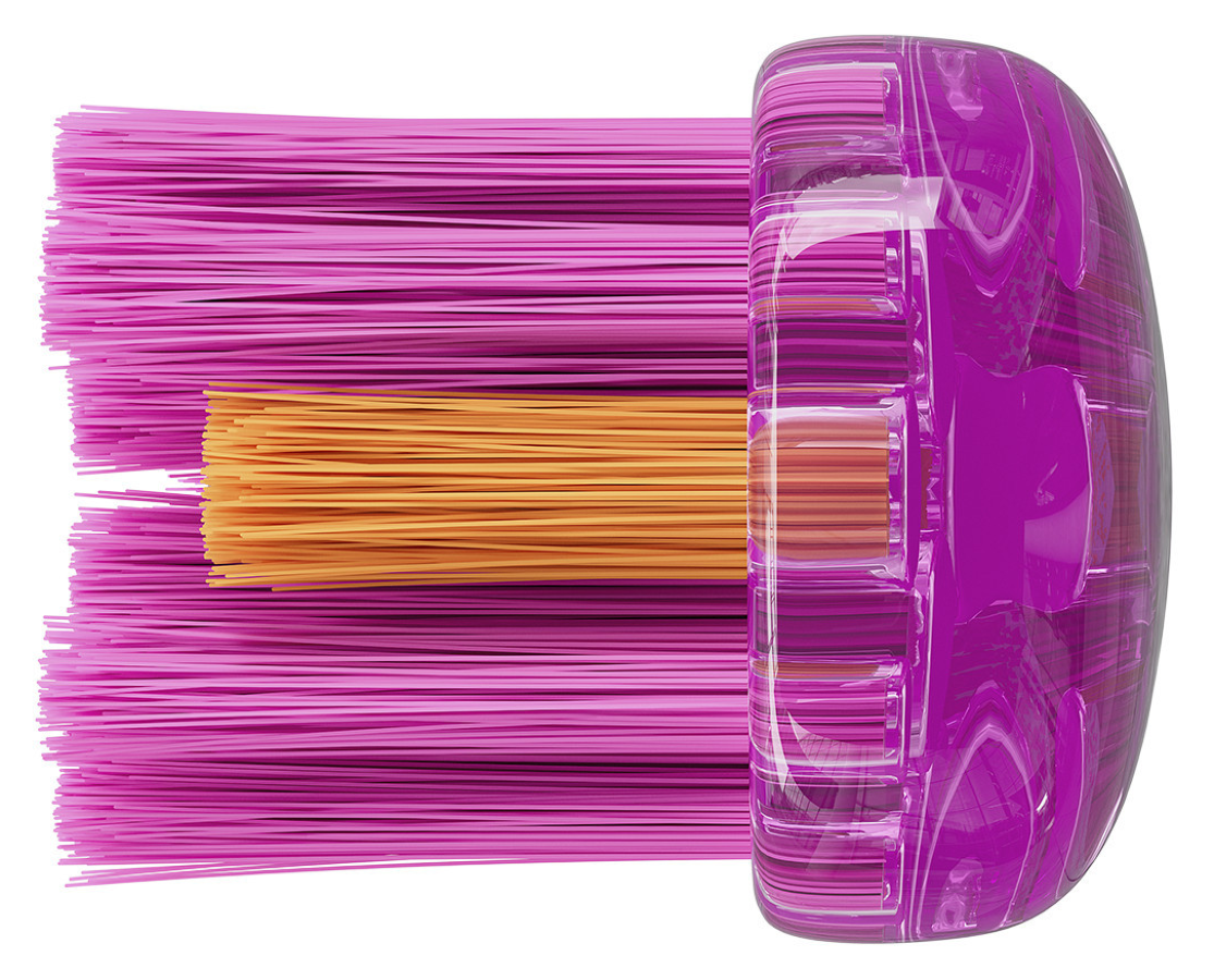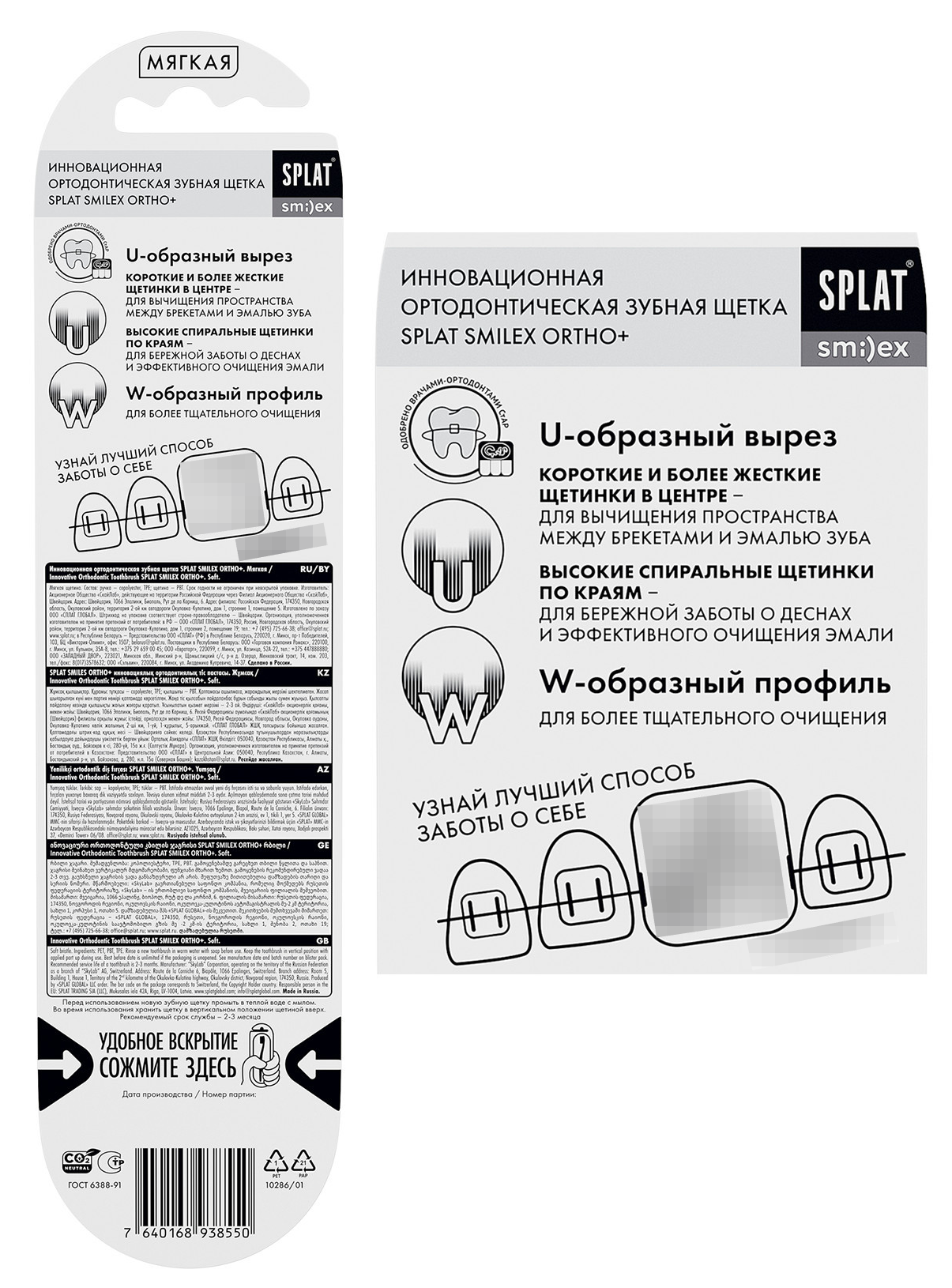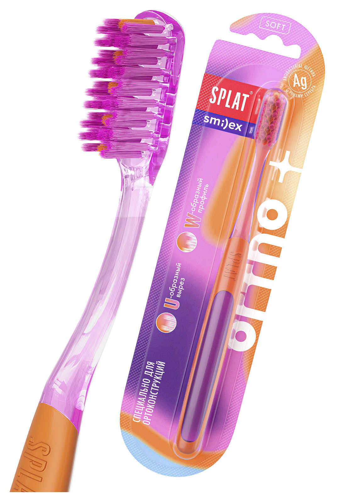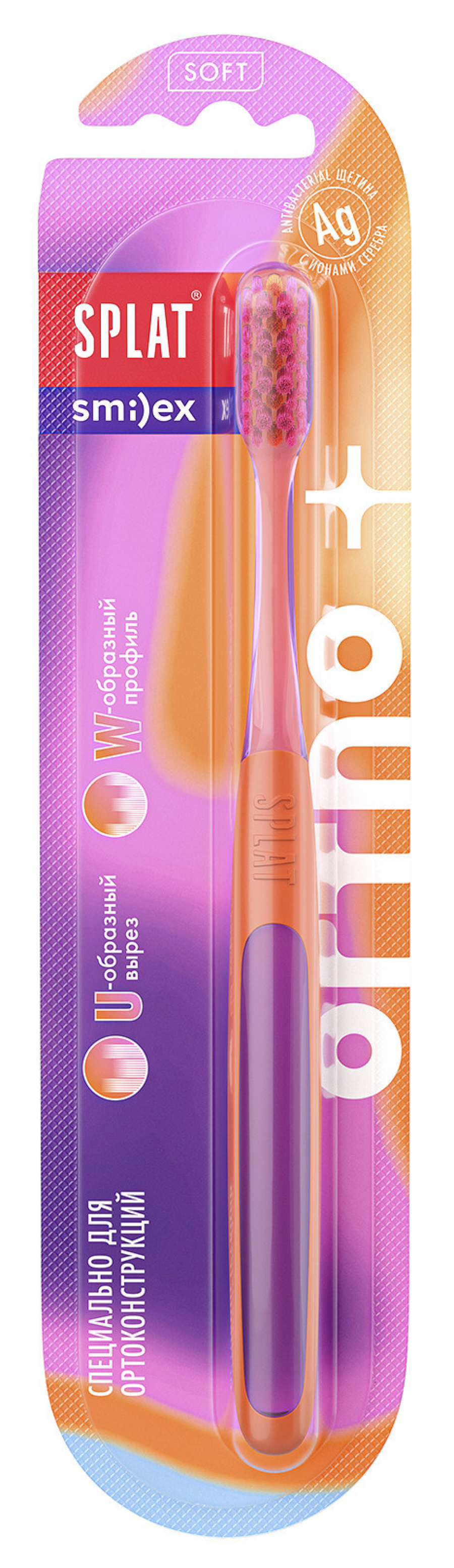 При чистке зубов обычной мануальной щеткой с ровным срезом щетинки могут застревать в замках ортоконструкций и вызывать дискомфорт. Поэтому ученые Инновационной лаборатории Splat разработали Инновационную ортодонтическую зубную щетку Splat Smilex Ortho+ с U-образным вырезом и двумя видами щетины. Специальное углубление в центре не позволяет щетине застревать в замках брекет-системы. Укороченные кончики щетинок центральных рядов очищают брекет-систему, а спиралевидные щетинки по бокам -эмаль зубов и межзубные промежутки. 3250 щетинок разной высоты не травмируют эмаль и десны. Антибактериальное покрытие щетины с ионами серебра предотвращает размножение бактерий, вызывающих кариес.Щетина зубной щетки Splat Smilex Ortho+ создана из безопасного высокотехнологичного материала — полибутилентерефталата (PBT), который практически не поглощает воду, долгое время сохраняет форму и упругость, за счет чего щетинки не деформируются и не топорщатся.