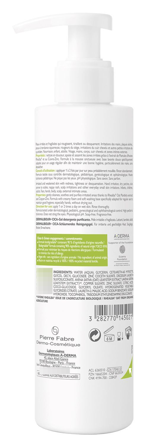A-Derma Dermalibour+ Cica Очищающий пенящийся гель. Очищающий пенящийся гельДля детей с 28 дней и взрослых. Для чувствительной и хрупкой кожи при покраснении, стянутости и шелушении. При раздражении кожи рук, склонности кожи к шелушению, опрелостях, раздражении кожи головы и других повреждениях кожи.
