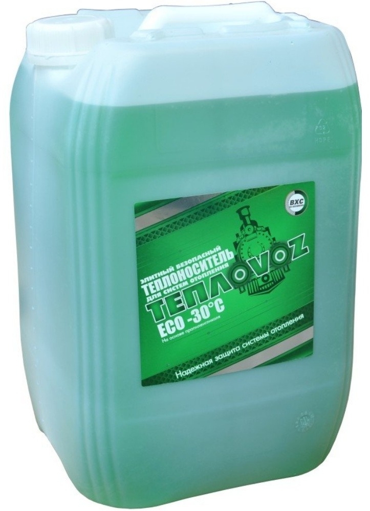 ТЕПЛОVOZ ECO - 30 готов к использованию. (основные компоненты- пропиленгликоль и вода) Теплоноситель элитного класса Область применения. Автономные системы отопления закрытого и открытого типа вентиляции и кондиционирования. Особенности. - Абсолютно нетоксичен и экологически безопасен. - Обладает смазывающим эффектом, что хорошо для двигающихся и трущихся деталей, так как продлевает срок службы системы. -Эксплуатационный период работы в системах отопления - 5 лет, в системах вентиляции и кондиционирования - 6 лет. -Обладает флуоресцентным эффектом, позволяющим выявлять проливы и протечки системы отопления.