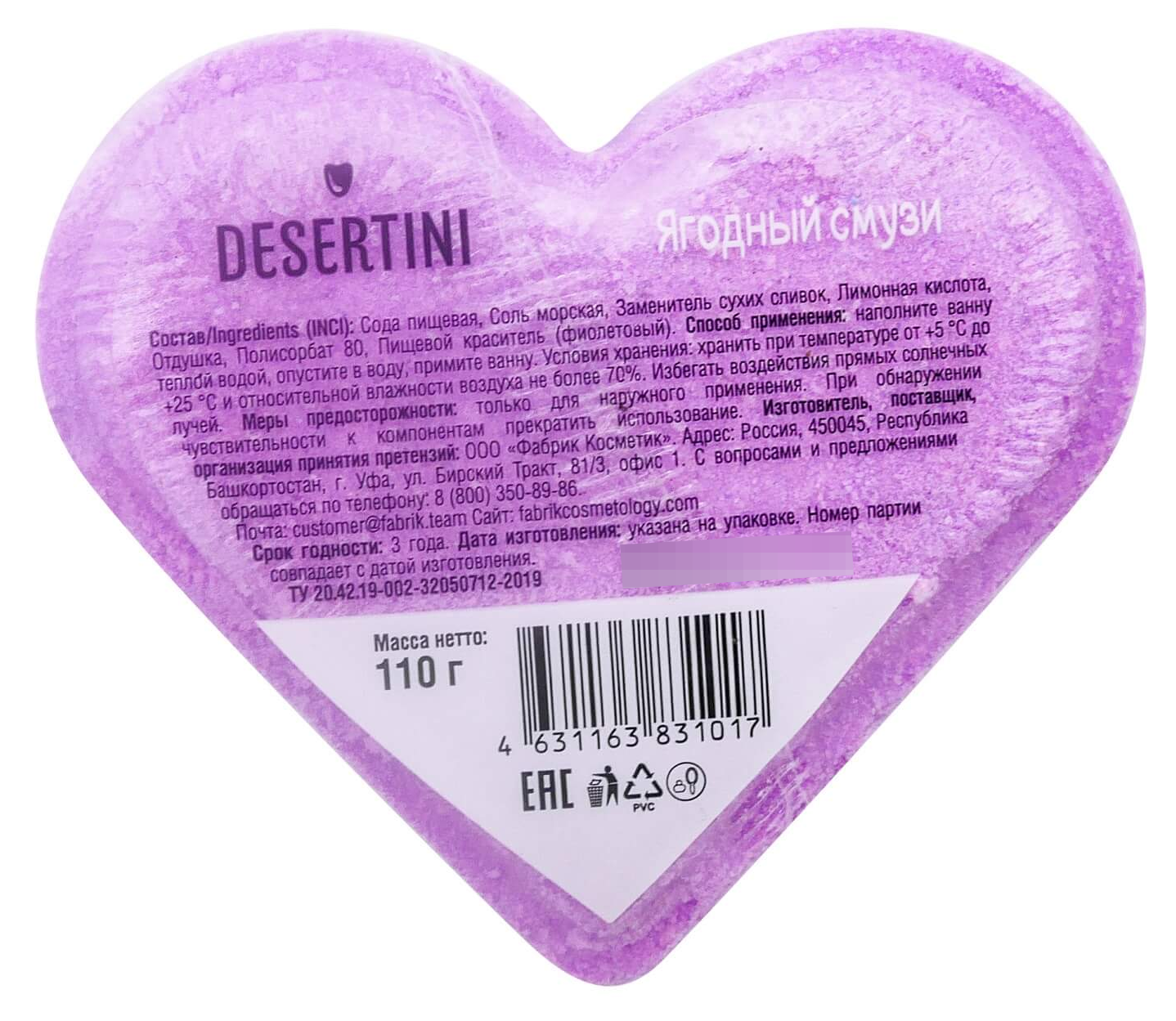 Бомба для ванны Desertini Ягодный смузи реализуется в индивидуальной упаковке — пакете. В ее составе содержатся следующие компоненты: Сода пищевая, Соль морская, Заменитель сухих сливок, Лимонная кислота, Отдушка, Полисорбат 80, Пищевой краситель (красный). Аромат — клубника. Вес — 110 г.