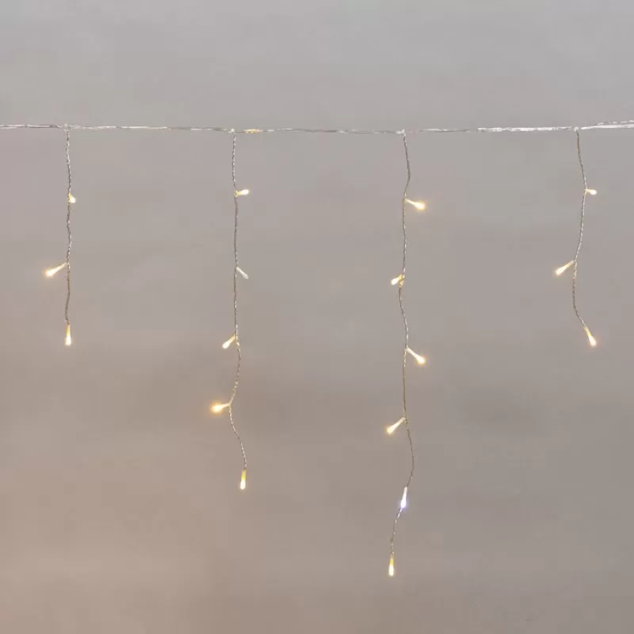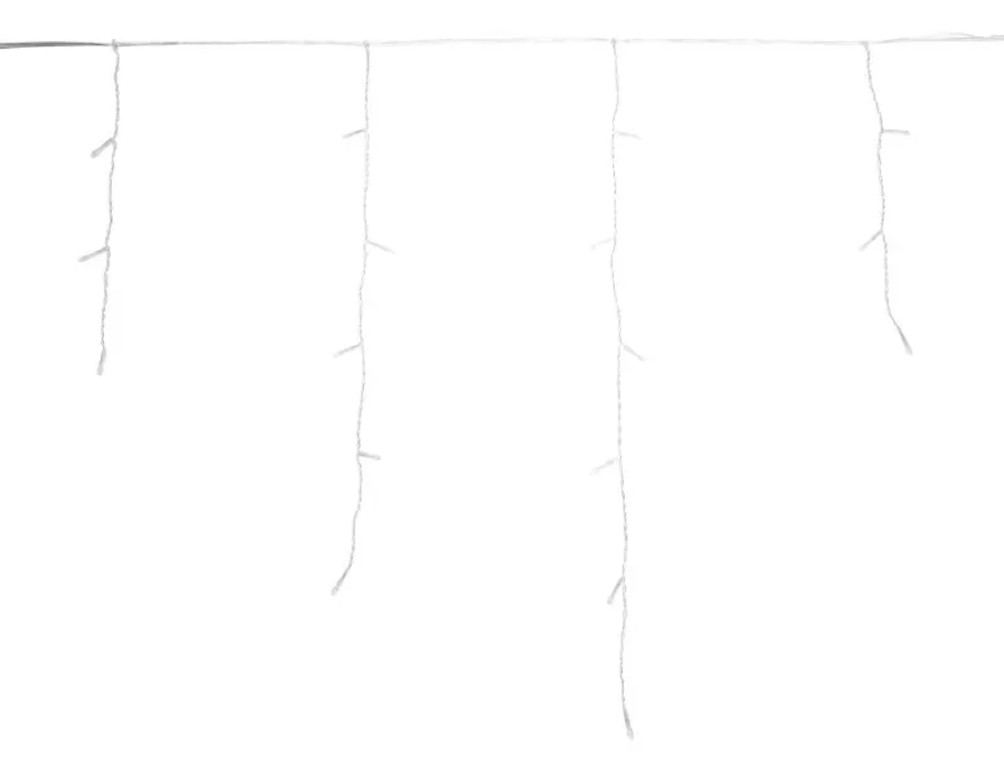 На каждой нити располагаются светодиоды, создающие эффект сверкающих сосулек. Цвет свечения — теплый белый.