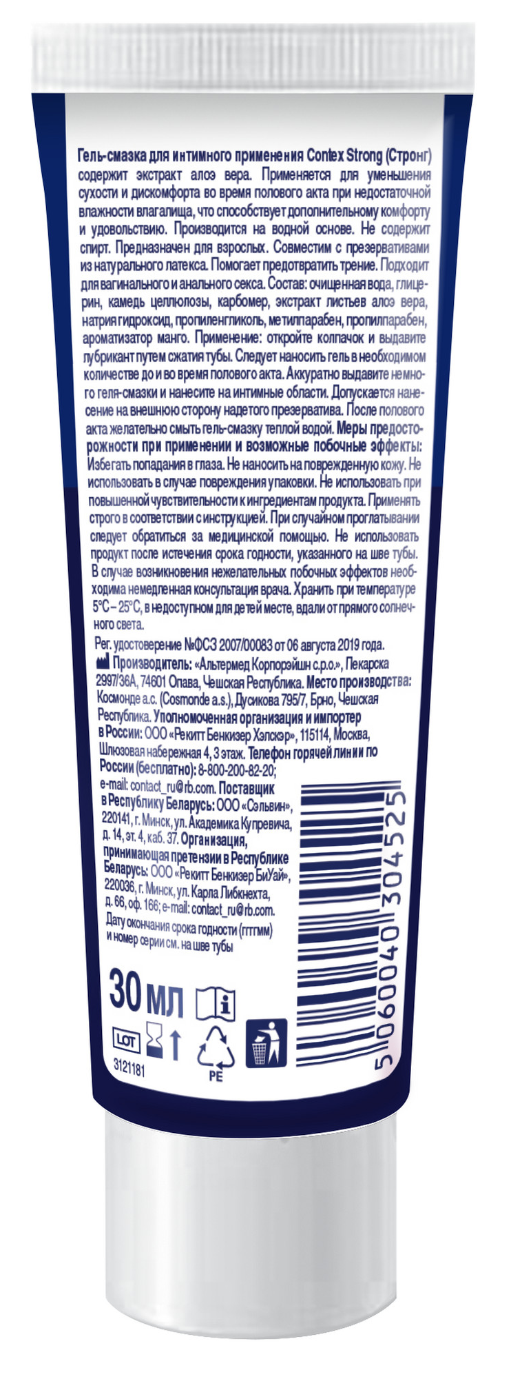 Лубрикант гель смазка Contex Strong реализуется в индивидуальной упаковке — тубе. Объем — 30 мл. В своем составе содержит: вода, глицерин, карбоксиметилцеллюлоза, карбомер, гидроксид натрия, метилпарабен, пропилпарабен, ароматизатор, экстракт Алоэ Вера.