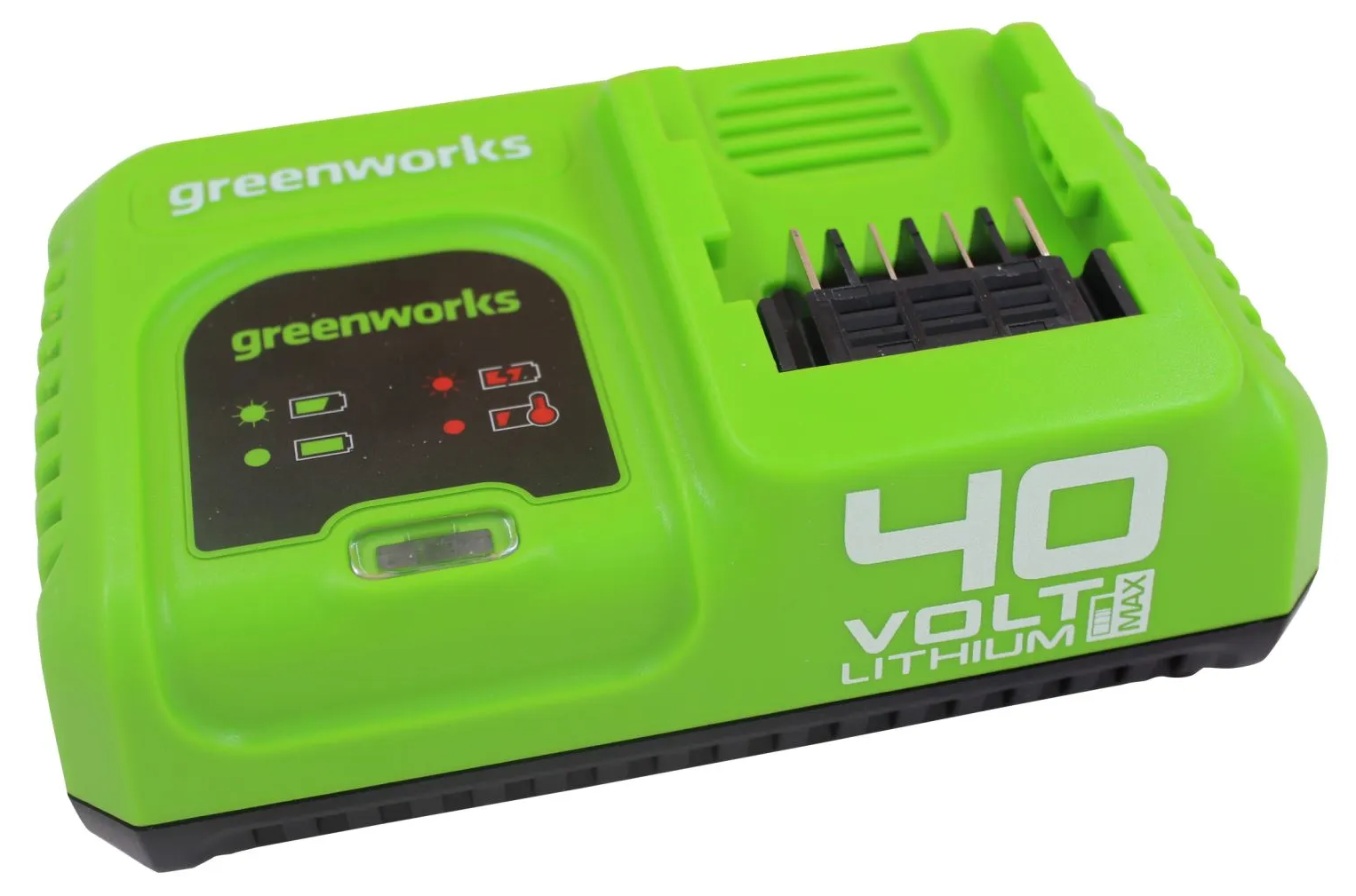 Быстрое зарядное устройство Greenworks G40UC5 оснащено встроенным охлаждением аккумулятора, светодиодным индикатором состояния заряда и чипом защиты от перезаряда, при достижение 100% заряда аккумулятора автоматически отключается.