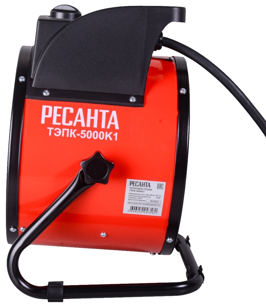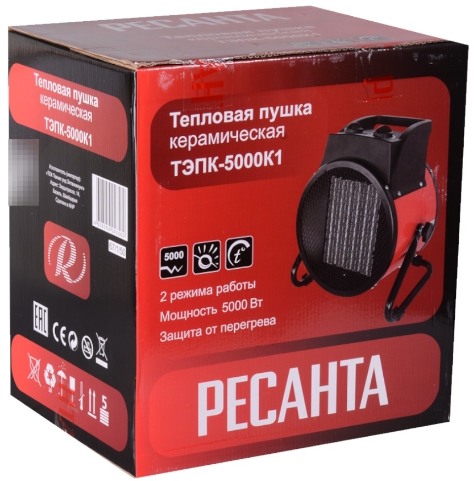 Пушка Ресанта ТЭПК-5000К1 выделяется своими техническими характеристиками. Напряжение — 220 (230) В. Потребляемая мощность вентилятора — 40 Вт. Мощность при обогреве — 5 кВт. Максимальная площадь обогрева — 50 м². Расход воздуха — 400 м³/ч. Степень защиты — IP 20.