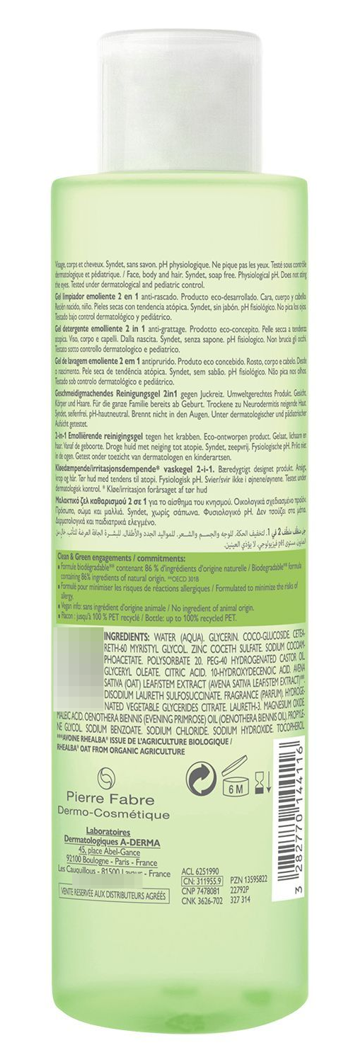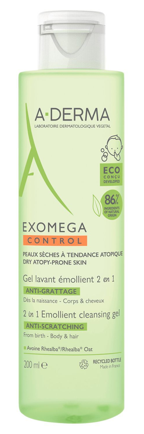 A-Derma Exomega Control Очищающий гель 2-в-1 для тела и волос. Мягко очищает, питает и смягчает сухую, склонную к атопии кожу, не раздражает глаза. Его биоразлагаемая формула поддерживает физиологический уровень pH и обладает нежным ароматом. Можно использовать с рождения.
