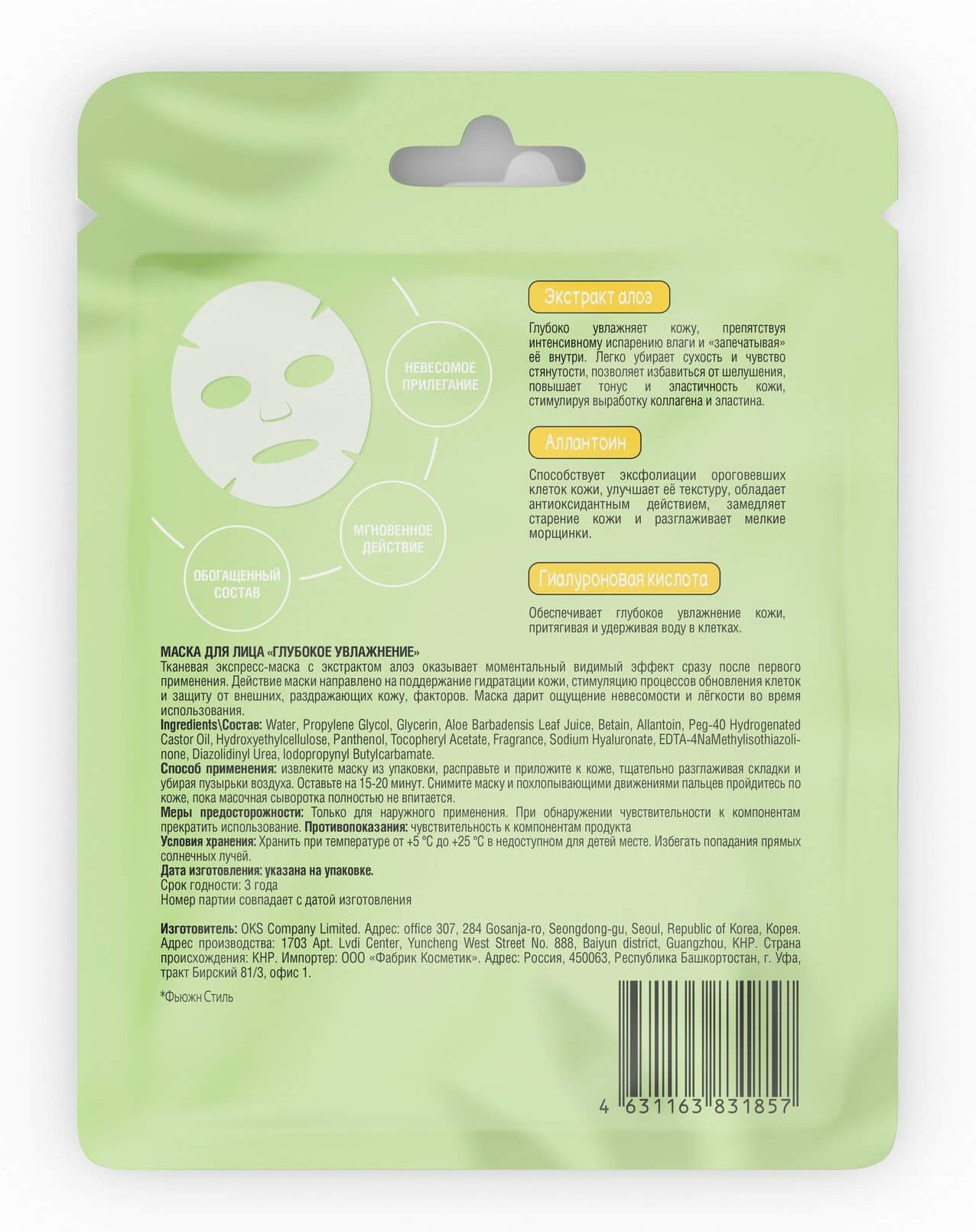 Тканевая экспресс-маска с экстрактом алоэ оказывает моментальный видимый эффект сразу после первого применения. Действие маски направлено на поддержание гидрации кожи, стимуляцию процессов обновления клеток и защиту от внешних, раздражающих кожу, факторов. Маска дарит ощущение невесомости и легкости во время использования.