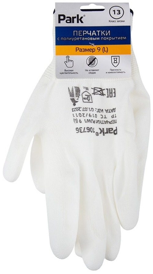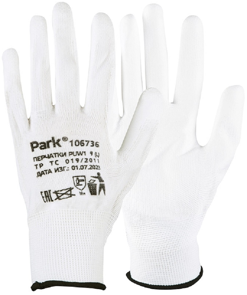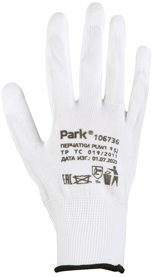 Перчатки защитные PARK / Парк рабочие из полиэстера с полиуретановым покрытием, белые, размер 9(L) / защита рук