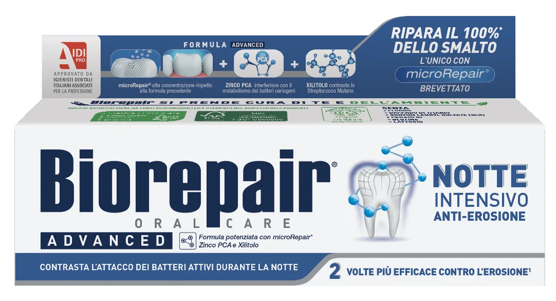 Biorepair Intensive Night Anti-erosion Зубная паста против эрозии эмали ночной уход без фтора укрепляет эмаль и защищает зубы. Паста зубная предназначена для ежедневной гигиены полости рта с целью обеспечения длительной защиты от кариеса, снижения растворимости и укрепления зубной эмали.