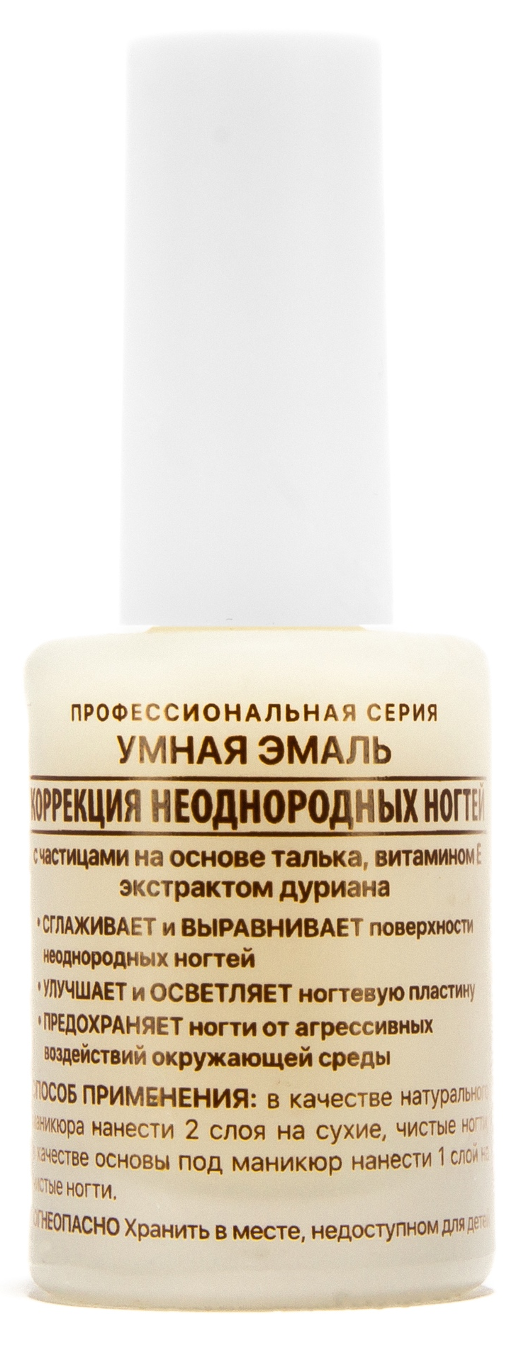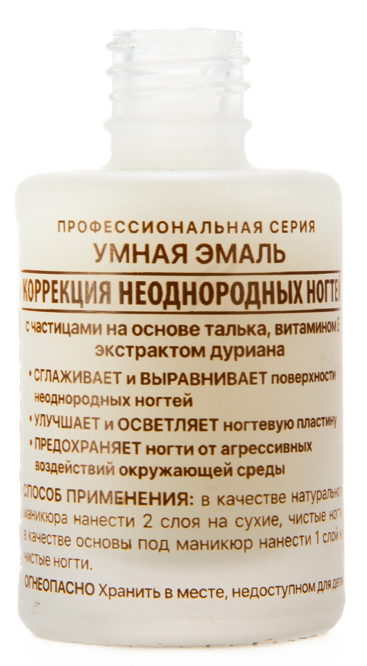 Умная Эмаль Корреция неоднородных нотей с частицами на основе талька. Сглаживает и выравнивает поверхности неоднородных ногтей. Укрепляет и осветляет ногтевую пластину. Предохраняет ногти от агрессивных воздействий окружающей среды.
