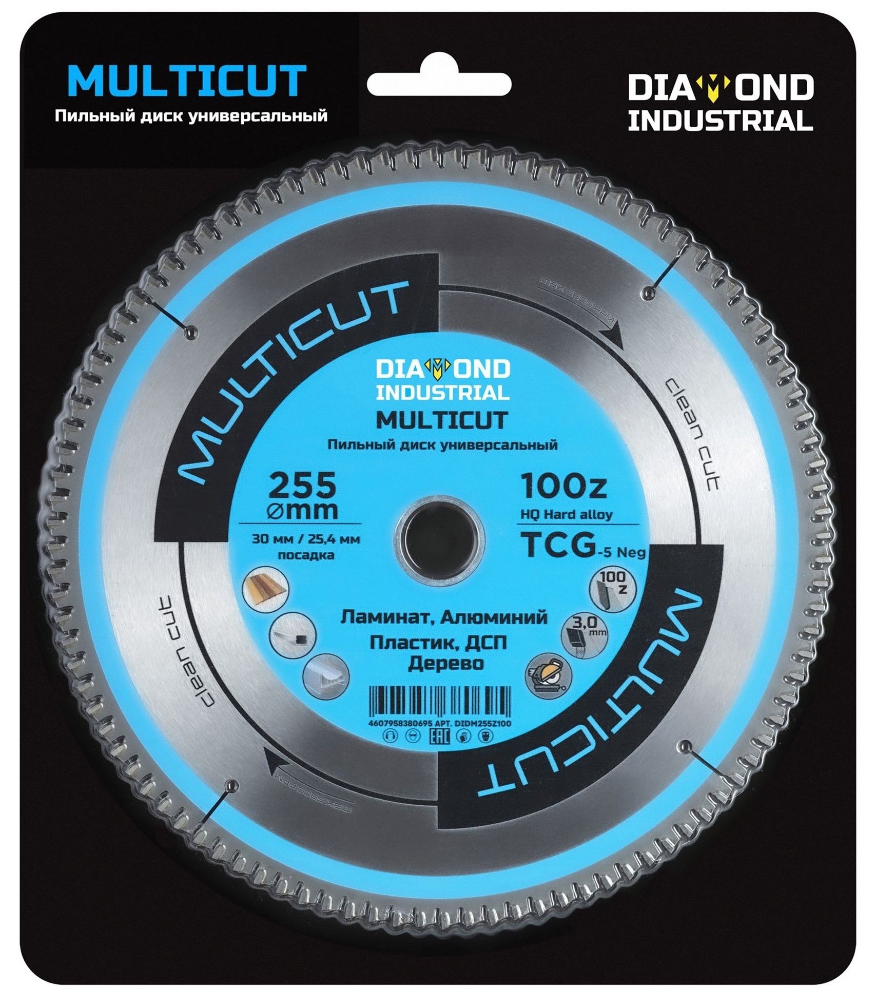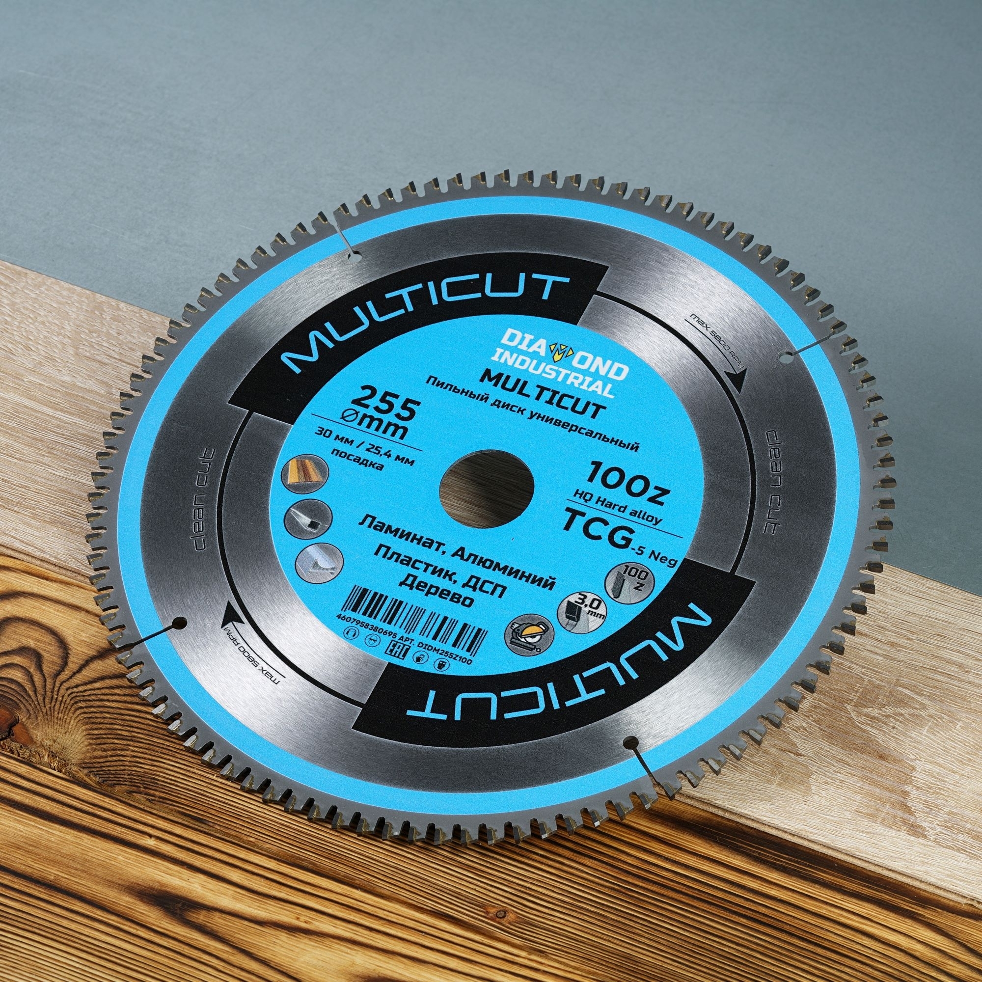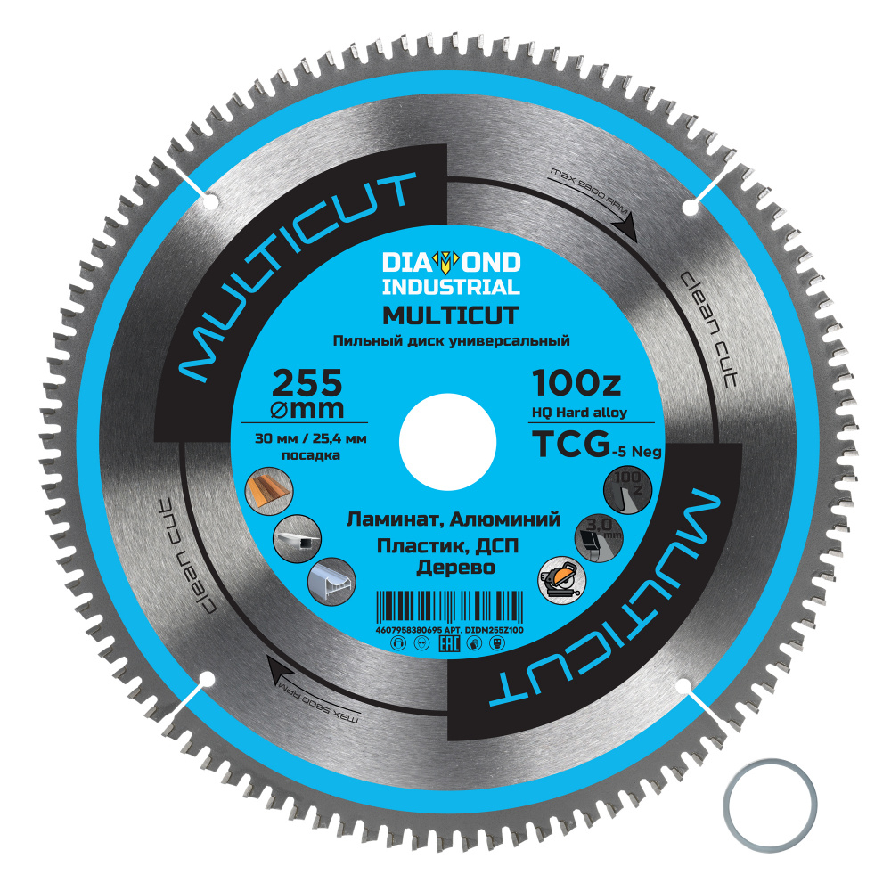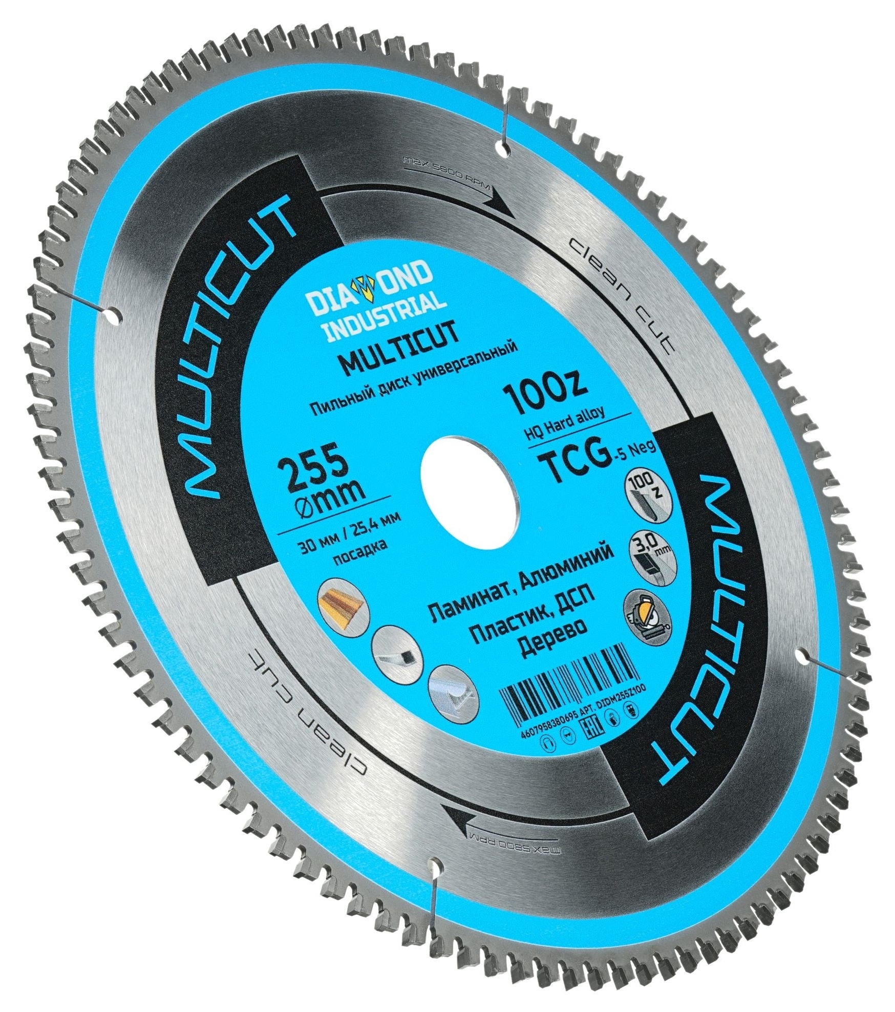 Диск пильный 255x30/25.4 мм 100Z (TCG) DIAMOND INDUSTRIAL DIDM255Z100 серия MULTICUT – диск профессионального качества для работ по алюминию, цветным металлам, пластику, ламинату, ДСП, дереву, комбинированным материалам. - диаметр 255 мм, посадочный диаметр 30 мм (в комплекте переходное кольцо с 30 мм на 25,4 мм), 100 зубов с победитовыми напайками. Толщина режущего зуба – 3,0 мм. Максимальное число оборотов/мин - 5800. Основа диска выполнена из углеродистой стали, напайки на режущих зубьях из высококачественного твёрдого карбидно-вольфрамового сплава («победита»). Качество сплава и размер твердосплавных напаек обеспечивают диску высокий рабочий ресурс, длительное сохранение скорости и качества реза и высокую пригодность к правке и заточке.