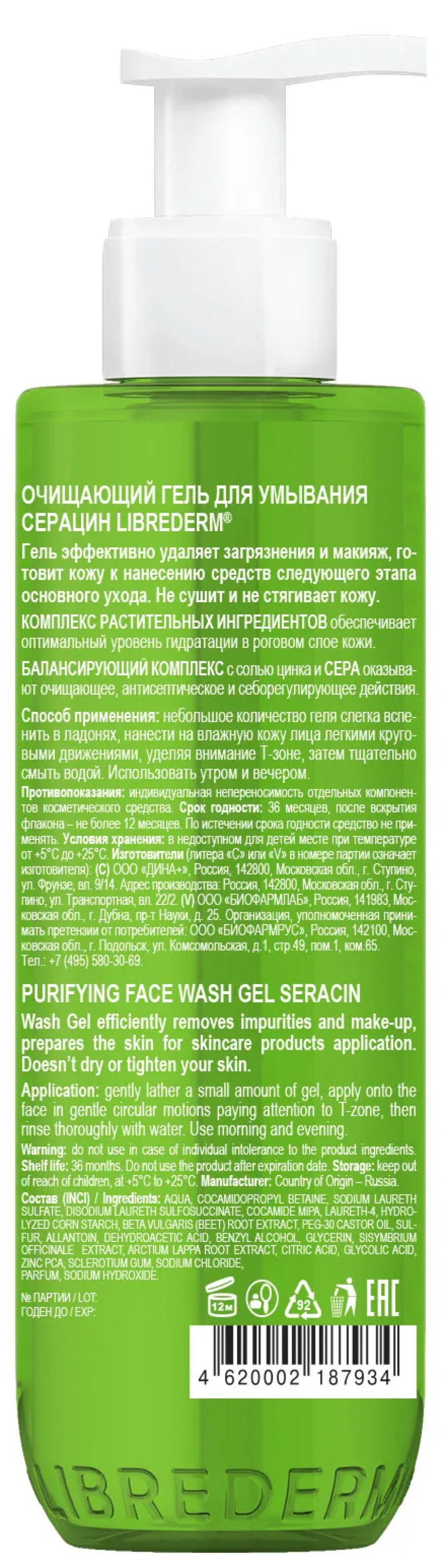 Librederm / Либридерм Гель для умывания лица Серацин очищающий, для жирной кожи, с комплексом растительных ингредиентов, 200мл / уходовая косметика