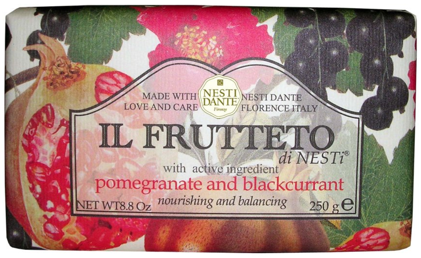 Nesti Dante — экологически чистое мыло, обогащенное растительными экстрактами и маслами. Производится во Флоренции с 1947 года по старинной котловой технологии варки мыла. Не содержит вредных поверхностно-активных веществ, сульфатов, парабенов, синтетических масел и искусственных красителей. Без аллергенов и ингредиентов животного происхождения. Мыло не размокает и быстро восстанавливается после длительного контакта с водой. Кулинарные традиции Тосканы, и Флоренции в частности, несколько отличаются от кухни остальной Италии. Но что остается неизменным так это большое разнообразие фруктов на десерт. Линия мыла Il Frutteto (Фруктовое) — настоящая фруктовая корзина с итальянским темпераментом! В составе Pomegranate and Blackcurrant (Гранат и черная смородина) содержится экстракт ягод черной смородины (ribes nigrum fruit extract) содержит витамины А, С, Р, В, минеральные соли, органические кислоты. Оказывает тонизирующее, антиоксидантное действие, питает, успокаивает и смягчает кожу, делает ее более эластичной, устраняет сухость и шелушение.