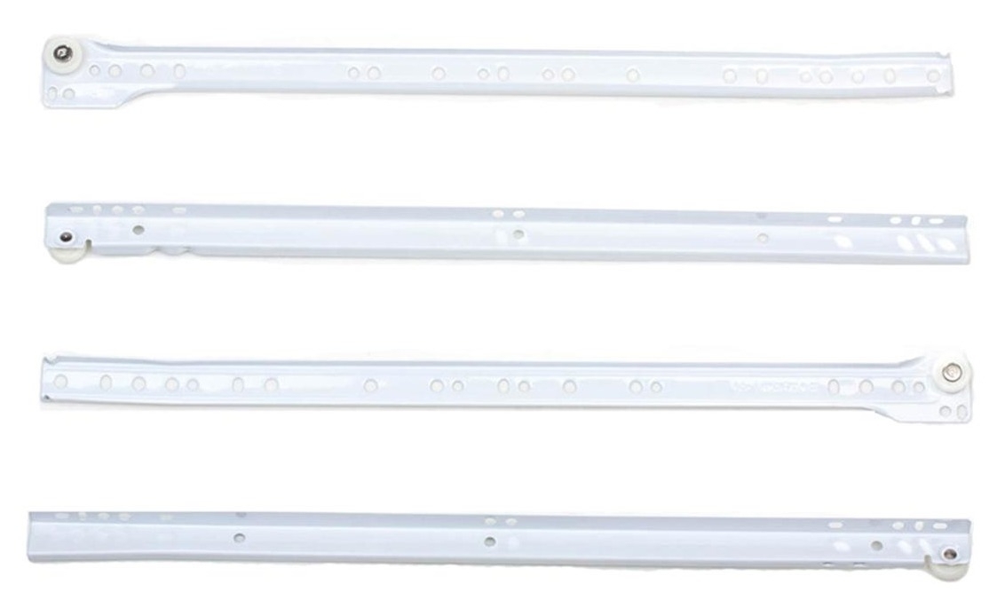 Роликовые направляющие реализуются в индивидуальной упаковке. Количество — 4 шт. Материал — сталь. Цвет — белый. Длина — 500 мм.