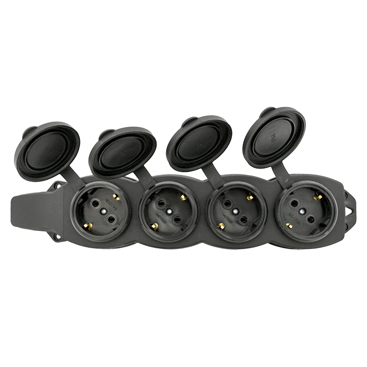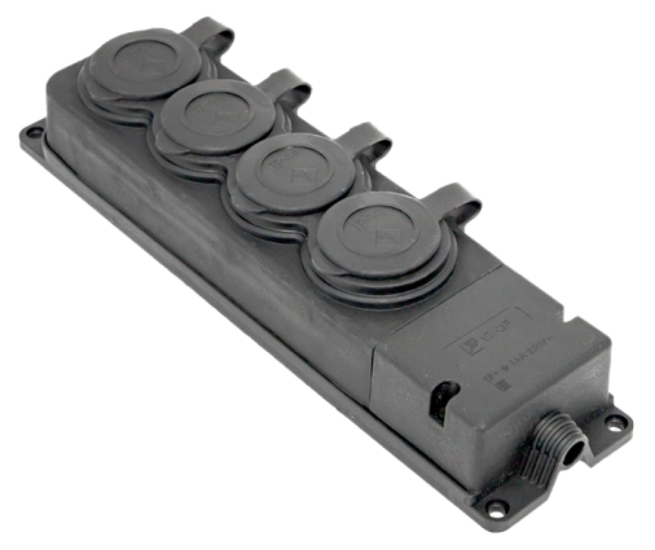 - Блок розеток EKF PRO 2P+PE 4 гнезда, 16А 230В IP44 с заземляющими контактами и защитными крышками, каучук черный RPS-020-16-230-44 - 1шт.