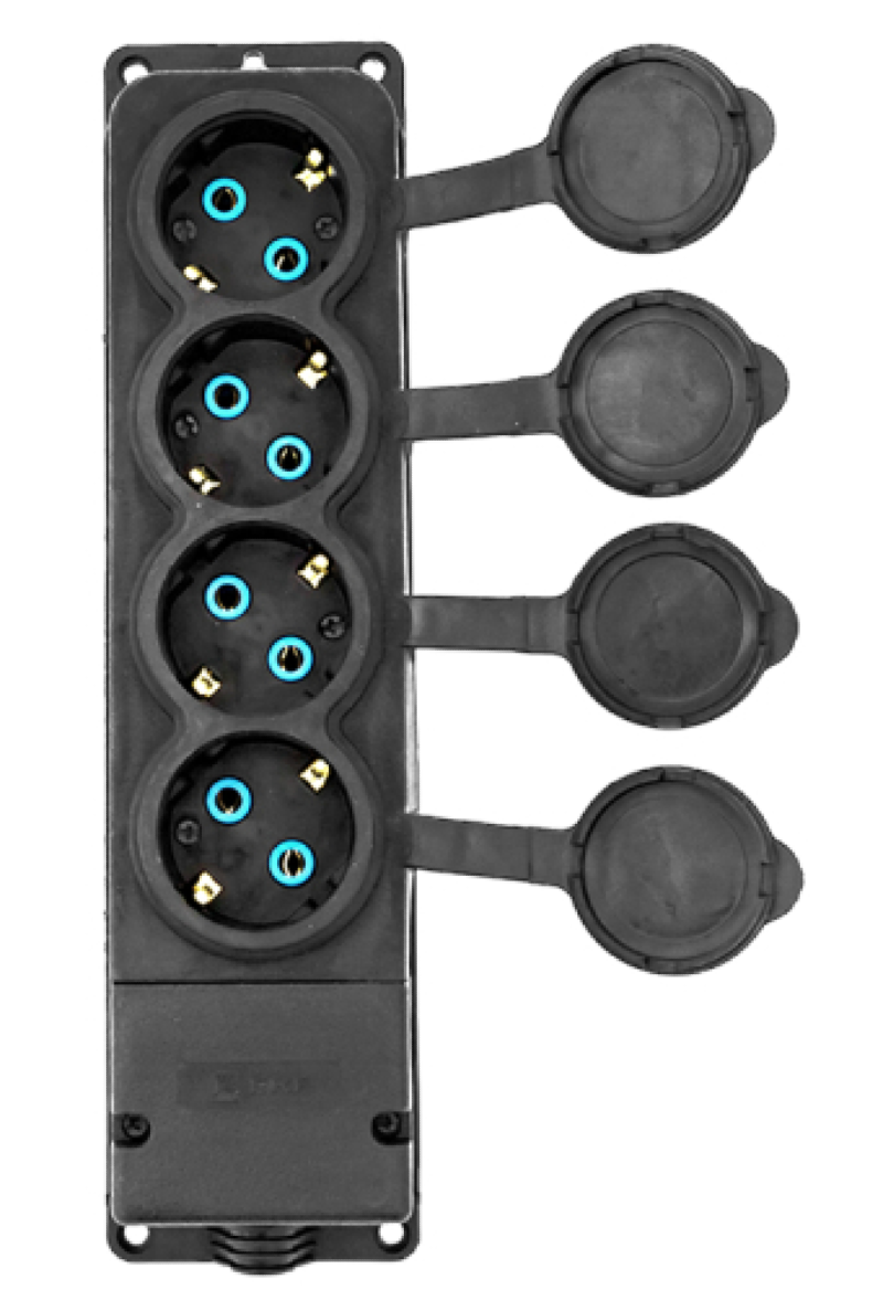 Колодка имеет кабельный ввод и каждое гнездо закрывается защитной крышкой, что позволяет обеспечить степень защиты IP44 даже в нерабочем положении.
