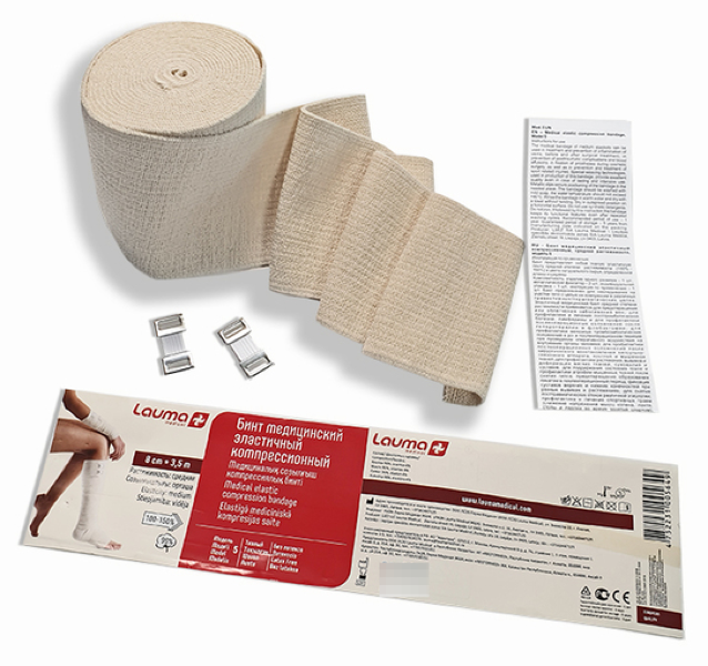 Представляет собой тканую эластичную ленту в цвете натурального сырья, определенной длины и ширины. Предназначен для накладывания на участки тела с целью их компрессии в различных превентивных/терапевтических целях.