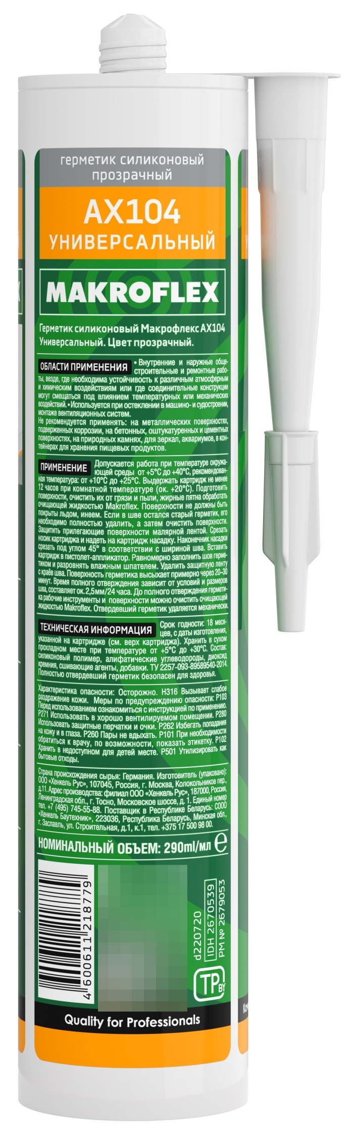 Герметик силиконовый универсальный «Макрофлекс AX104». Цвет бесцветный. Универсальный однокомпонентный герметик на основе силиконового полимера (ацетокси). Применяется при общих строительных и ремонтных работах как внутри, так и снаружи помещения. Содержит фунгициды — асептические вещества, препятствующие росту плесени. Герметик легко наносится на большинство покрытий — например, на стекло, глазированную керамическую плитку и алюминий. Герметик обладает высокой устойчивостью к воздействию меняющихся атмосферных условий и химических веществ. Хорошая адгезия к эмали, стеклу, керамике, дереву, металлам, эмалированным покрытиям. Устойчив к атмосферным и химическим воздействиям. Устойчив к воздействию ультрафиолетового излучения. Водостоек. Эластичен. Нельзя окрашивать.