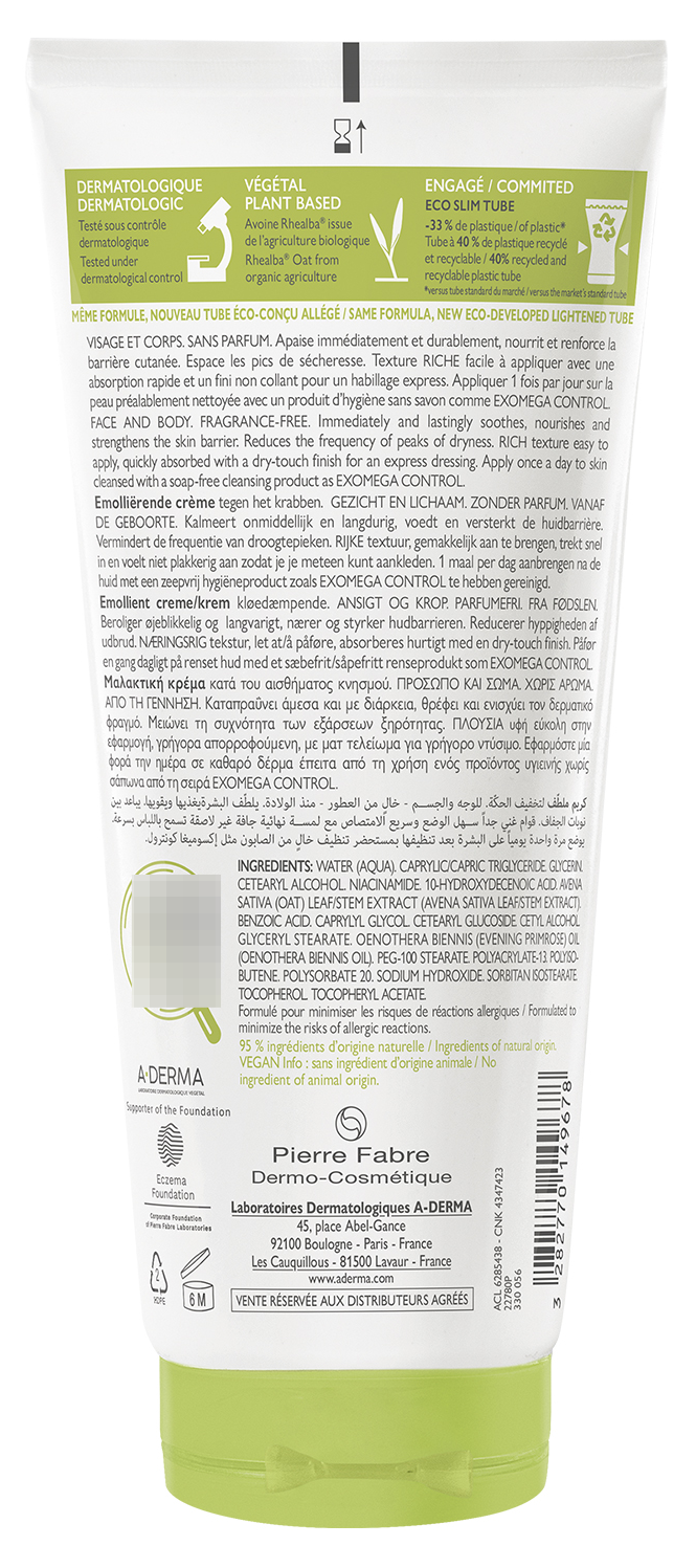 Exomega Control смягчающий крем (эмолент) способствует снижению сухости и раздражения, вызванного сухостью кожи. Крем эффективно успокаивает и питает кожу, улучшая состояние кожи на длительное время. Всего 1 нанесение в день = 24 часа эффективности. Протестировано под контролем дерматологов и педиатров. Не содержит отдушек.Формула создана с целью минимизации риска аллергических реакций.