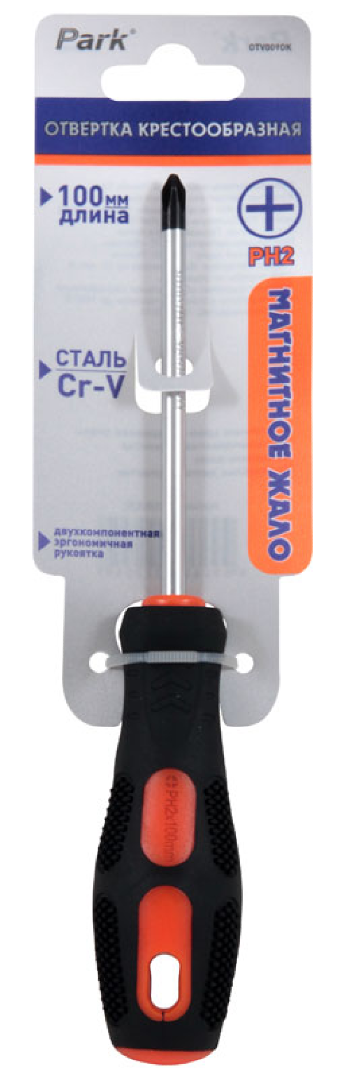 - Отвертка крестовая Park с двухкомпонентной рукояткой, из хромованадиевой стали, черная, наконечник PH2, стержень 100мм - 1шт.