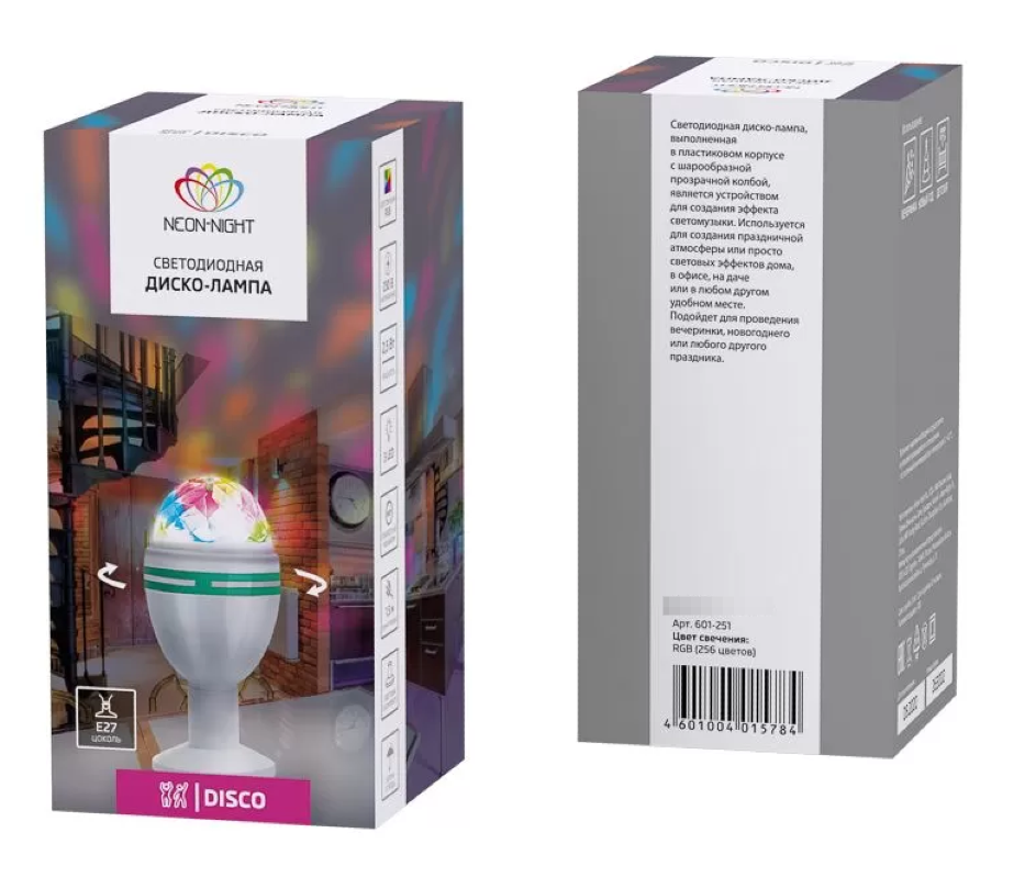 - Диско лампа Neon-Night на подставке с цоколем Е27, размер 16х8х16см, 220V RGB мощностью 6Вт - 1шт.