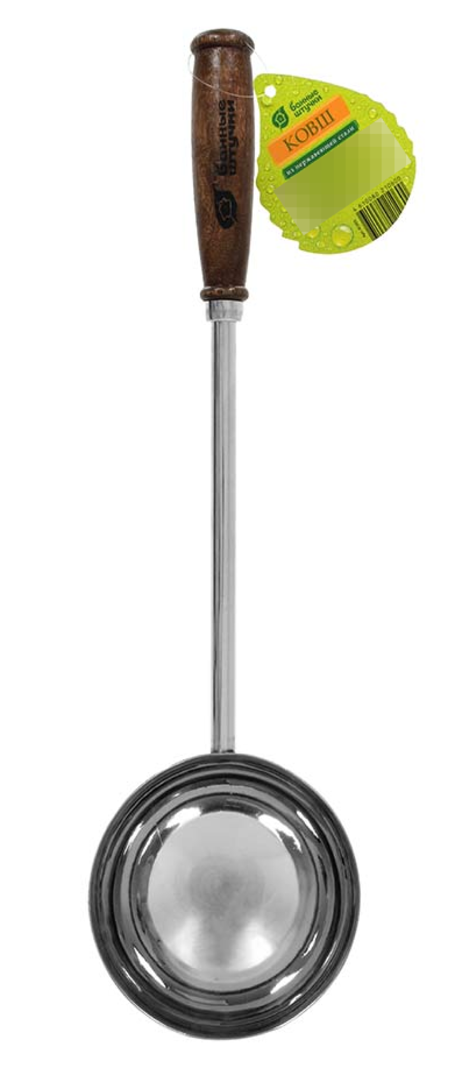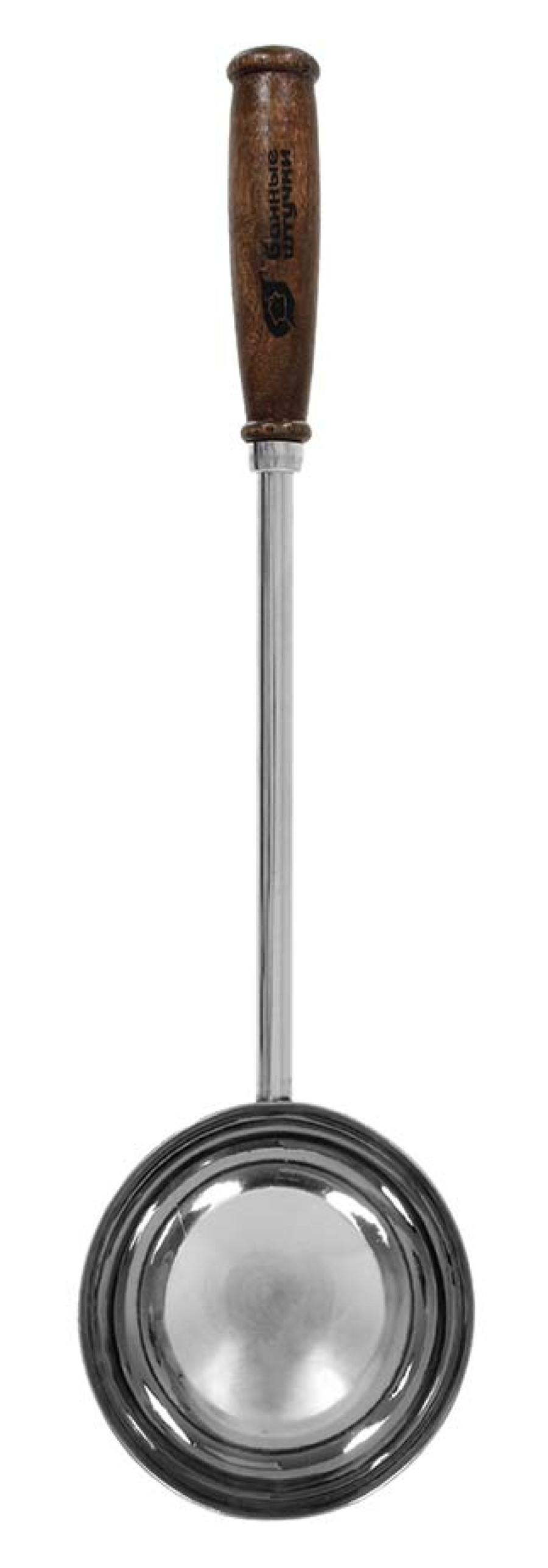Ковш для бани Банные Штучки реализуется в индивидуальной упаковке. Изготовлен из нержавеющей стали и дерева. Длина — 47 см.
