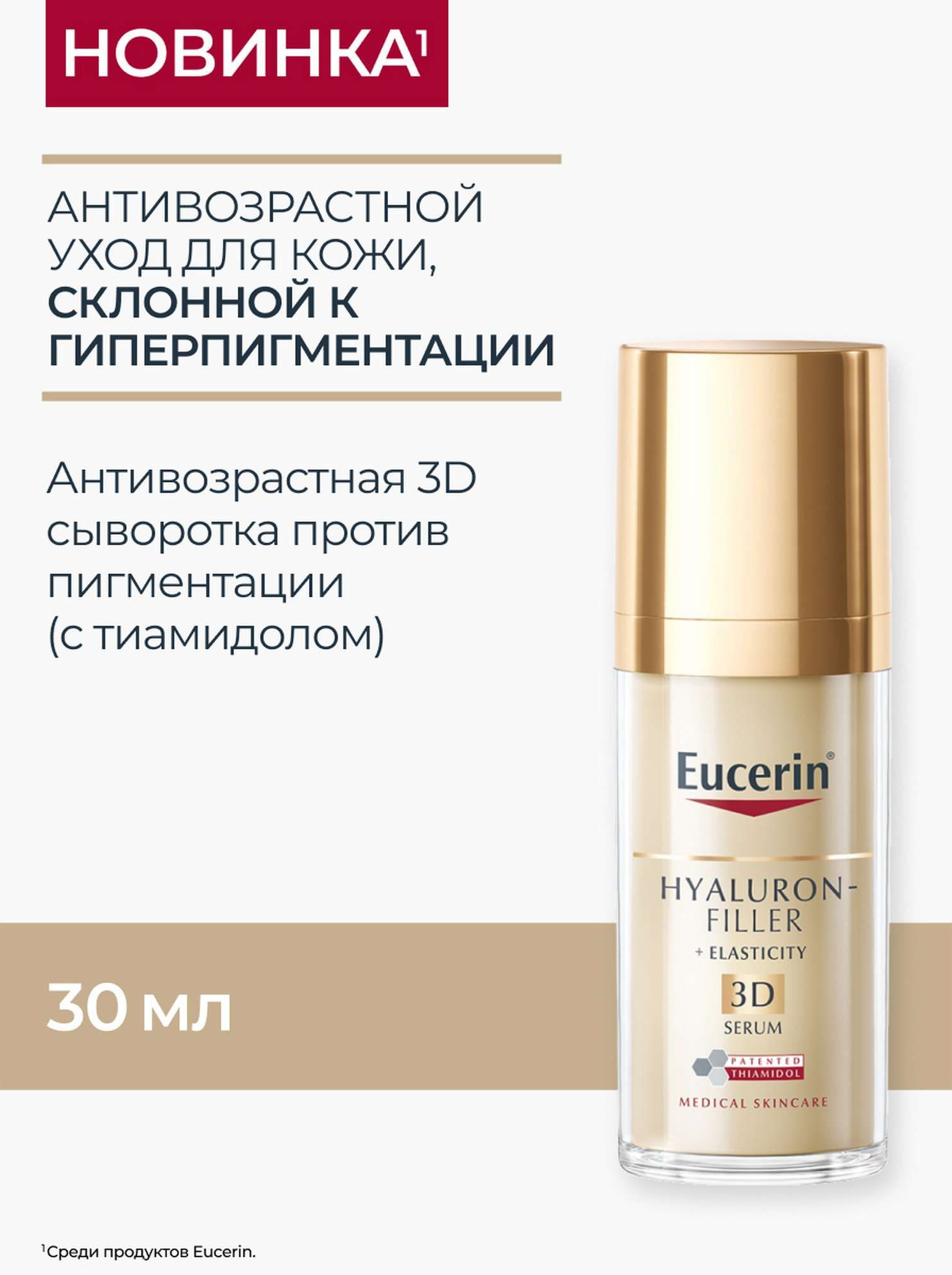 Антивозрастная 3D сыворотка против пигментации Eucerin Hyaluron-Filler + Elasticity повышает эластичность кожи и уменьшает морщины и возрастные пигментные пятна.