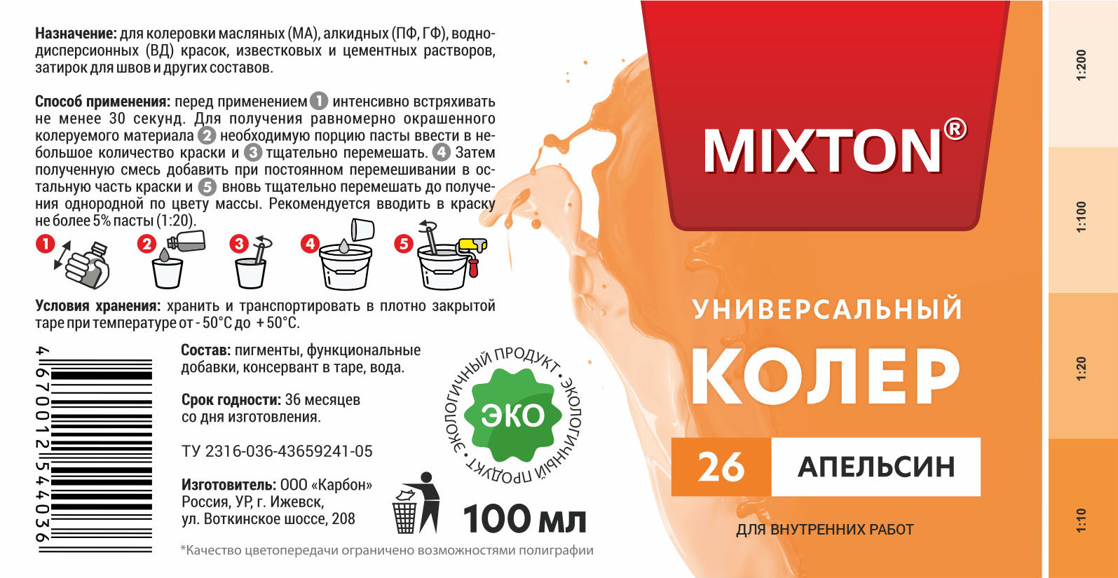 MIXTON — колер для краски, который гарантирует насыщенность и равномерное распределение пигмента. Благодаря особой формуле, продукт подходит как для интерьерных работ, так и для оформления фасадов. Просто добавьте его в базовый состав, и вы получите стойкий цвет.