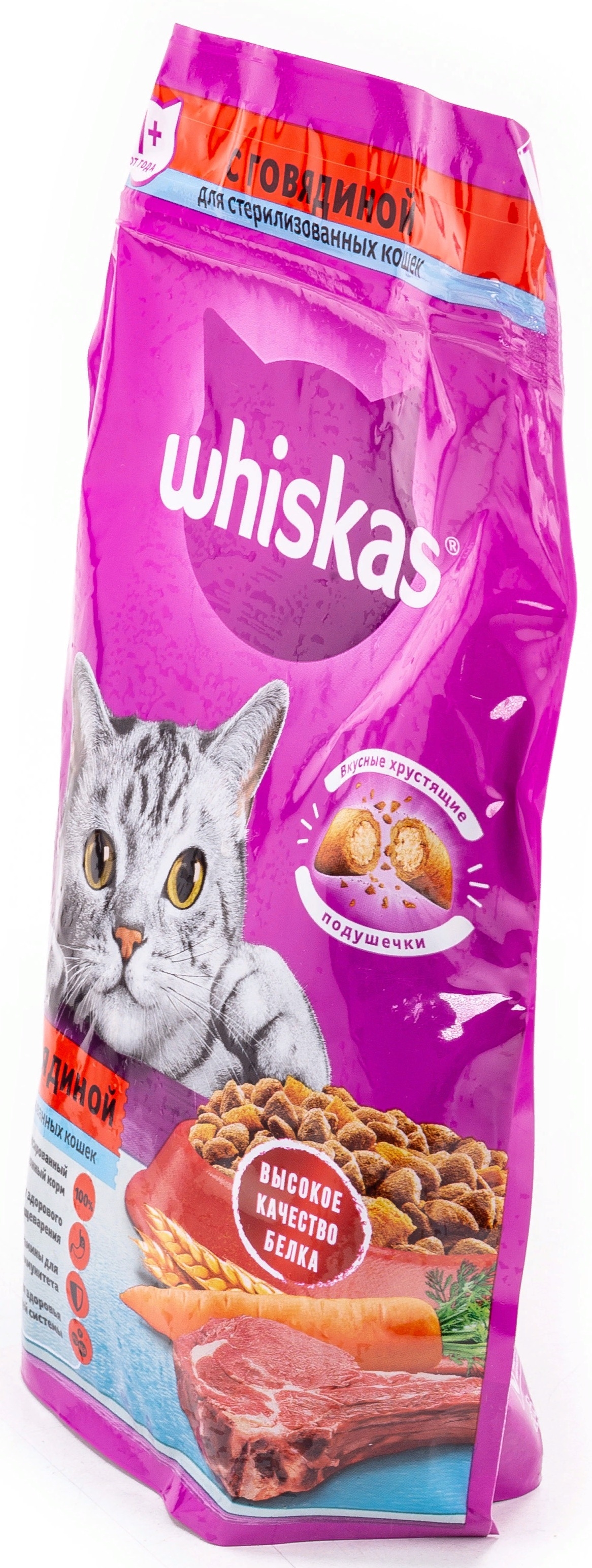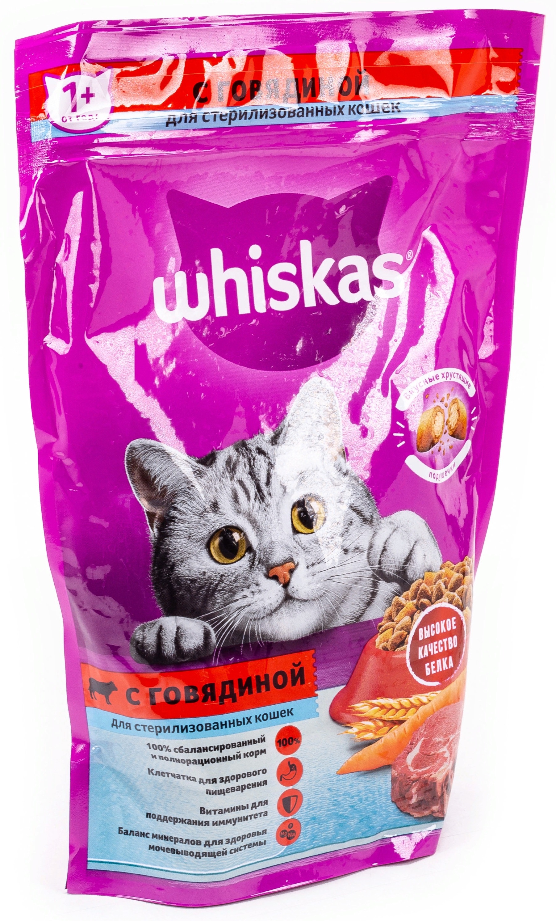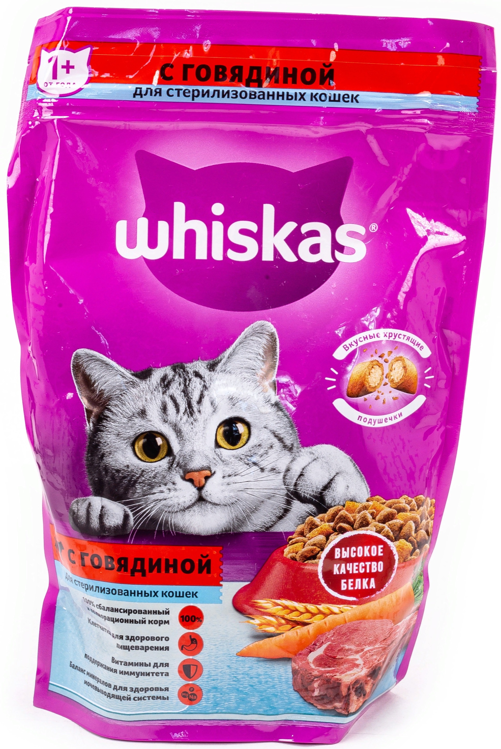 Хотите наблюдать у себя дома здорового и энергичного питомца? Обеспечьте его правильным питанием. Поможет в этом корм сухой для стерилизованных кошек Whiskas подушечки с говядиной.
