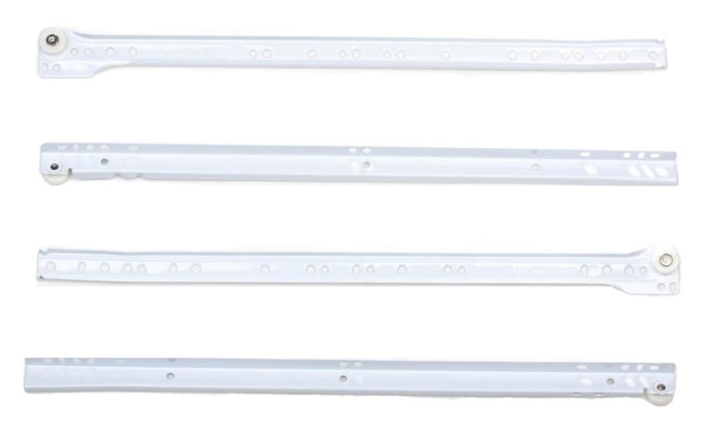 Роликовые направляющие реализуются в индивидуальной упаковке. Количество — 4 шт. Материал — сталь. Цвет — белый. Длина — 450 мм.