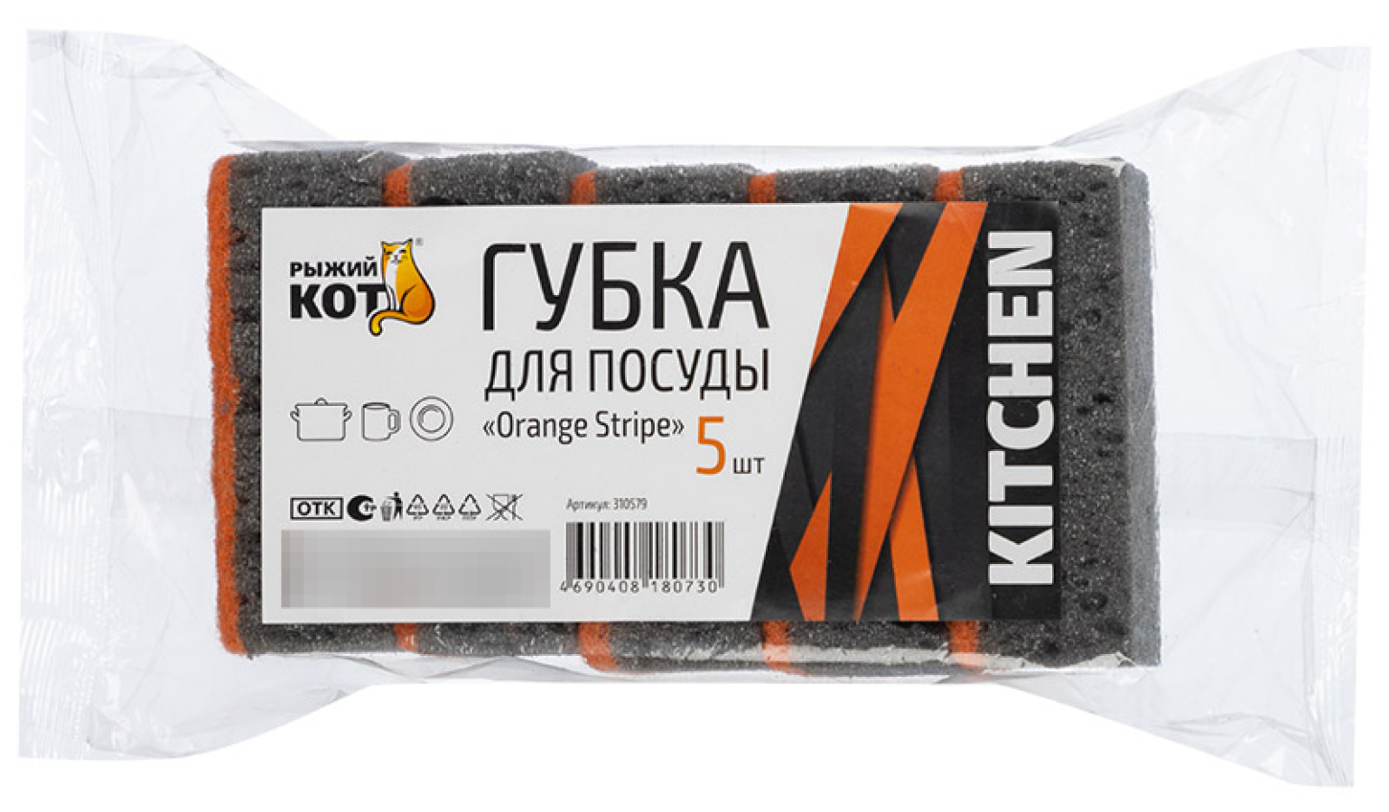 Губка для посуды Рыжий кот Orange Stripe из поролона, с абразивным слоем, 98х67х35мм, в упаковке 5шт. / хозяйственные товары