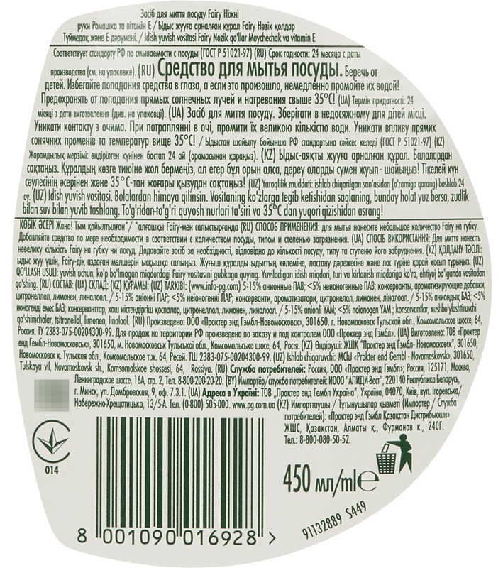 Средство для мытья посуды Fairy Нежные руки Ромашка и витамин E 450 мл Назначение Средство предназначено для мытья различной посуды от различных загрязнений. Образует обильную и устойчивую пену. Растворяет жир даже в холодной воде. Мягкий для рук. Способ применения Для мытья нанесите небольшое количество средства на губку или посуду. Добавляйте средство по мере необходимости. После мытья ополосните посуду. Меры предосторожности Беречь от детей. Избегать попадания в глаза. При попадании в глаза тщательно промыть их водой. Состав 5%-15% анионные ПАВ; <5% неионогенные ПАВ. Дополнительно: отдушка, консерванты, цитронеллол, лимонен, линалоол.