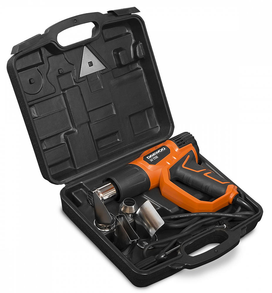 Строительный фен DAEWOO / Дэу DAF 2200 пистолетный, с регулировкой температуры, в кейсе, оранжевый, 50-550°С, 500л/мин, 299.5х96х219мм, 2200Вт / инструменты